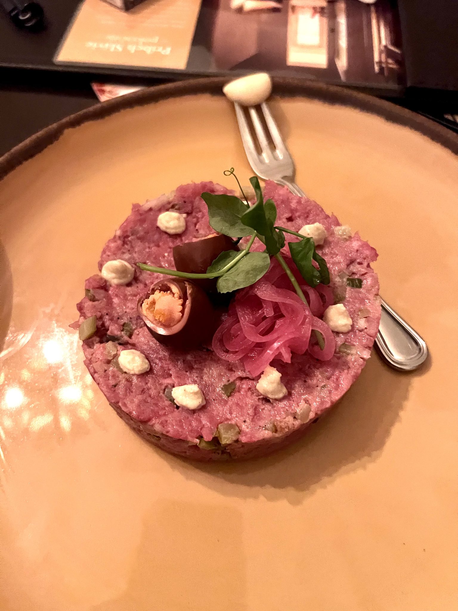 Takmer všetko, čo je možné získať lokálne, je od miestnych producentov či pestovateľov, bylinky sú dokonca vlastné. Tatarák sa tu podáva hrubší, výrazne mäsový, podporený špikovou majonézou, kaparami, prepeličím vajíčkom.