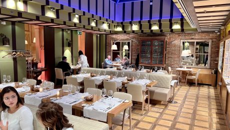 Dominantou je priestranná otvorená kuchyňa, kde môžeš počas jedenia pozorovať kuchársky, cukrársky či barmanský koncert. Reštaurácia má odhadom cez 100 miest na sedenie, čomu zodpovedá aj množstvo personálu. V kuchyni a za barom je minimálne 10 ľudí a na pľace dobrých 15. Čo je ale podstatné, nech sedíš kdekoľvek, necítiš sa byť rušený hosťom ani obsluhou. Všetko plynie tak nejak prirodzene a uvoľnene.