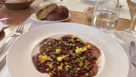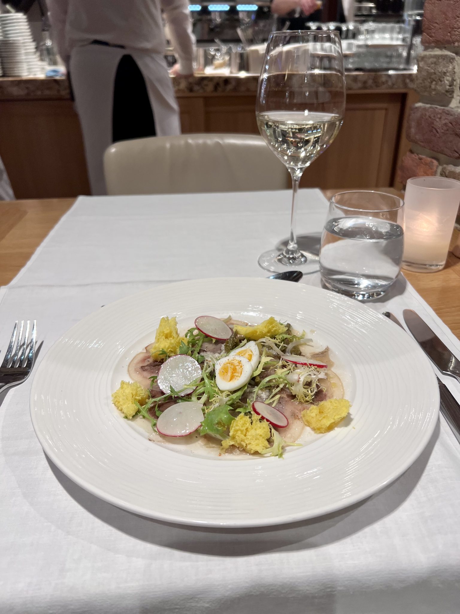 Dávno som sa na niečo netešil tak ako na carpaccio z teľacej hlavy – na teplo a v aspiku z kolagénu. Kto má tieto jedlá rád, určite rozumie vzrušeniu, ktoré som prežíval pri čakaní na tento málo rozšírený kus neba. Stlačené kusy mäsa a tuku nakrájané na tenučko. Vajíčko dotváralo krémovosť, šalát chrumkal. Skvostný koncert sviežosti, lepkavosti a mastnoty s výraznou chuťou mäsa. Jemná pikantnosť chrenu a horkosť výhonkov chmeľu dotvorili najlepšie predjedlo za dlhú dobu.