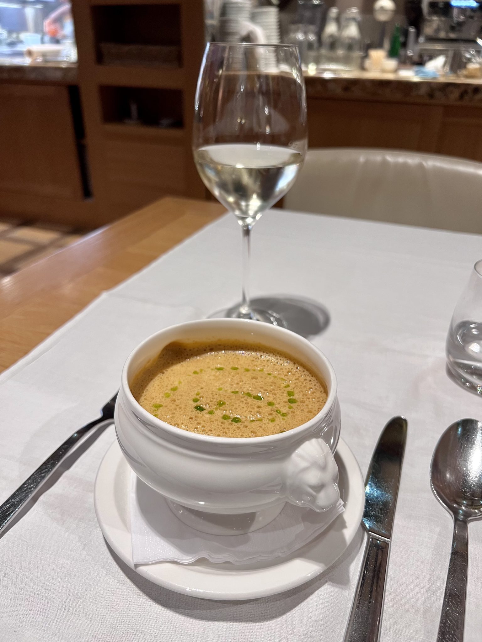 Račia polievka je niečo, čo sa u nás už často nevidí. A pritom raky kedysi boli absolútne bežnou súčasťou jedál v našom regióne. Výborne silný krém, niečo ako krevetový bisque, doplnený o Armagnac, ktorý dodal pikantnosť. Tu však mám dve mini výhrady. Polievka prišla až extrémne horúca, takže som musel pomerne dlho čakať a chýbala jej k dokonalosti troška soli.