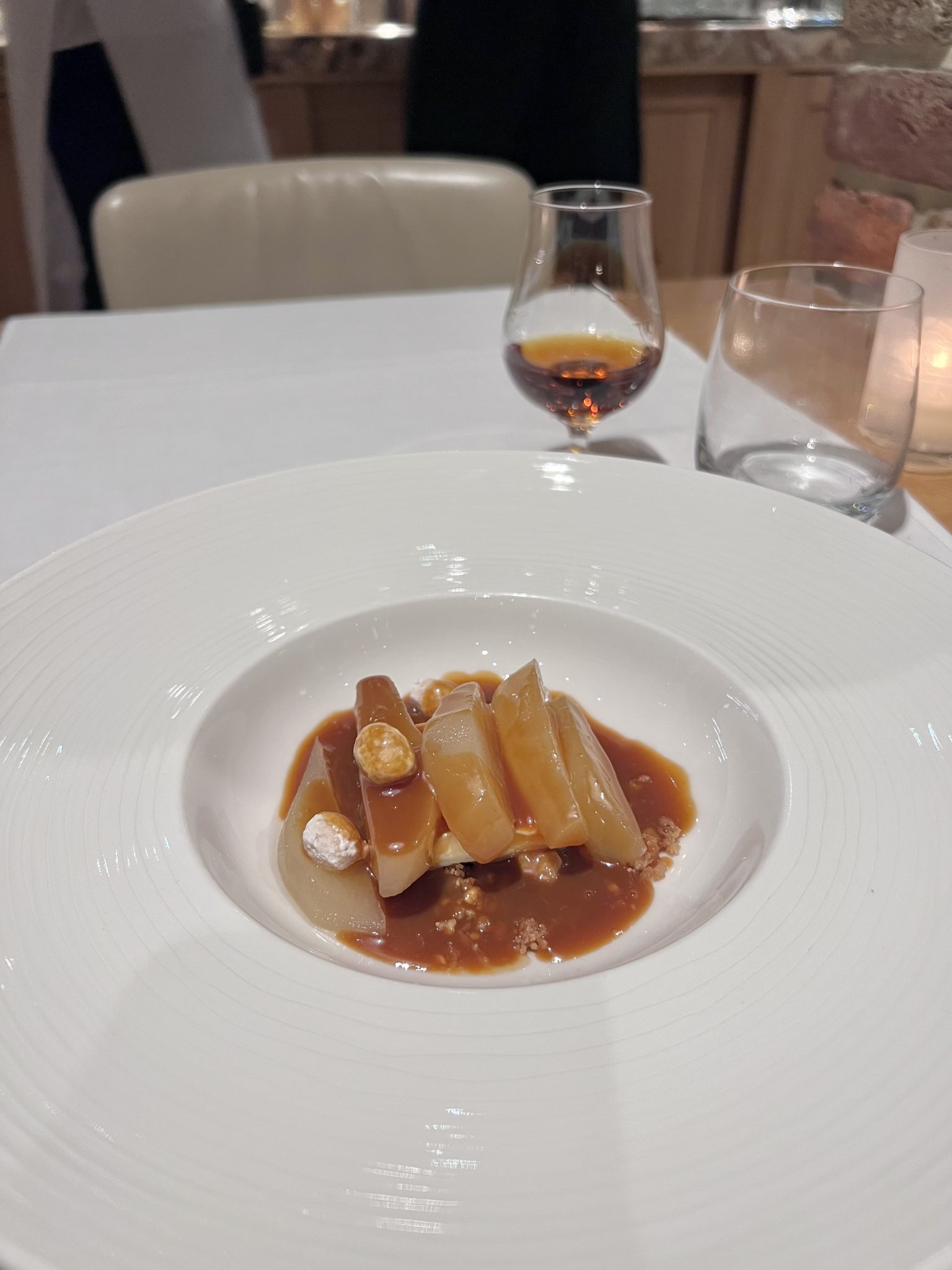 Marinovaná hruška bola jeden z najlepších dezertov, aké som jedol. Hádam od prvého dezertu – dekonštruovaného jablkového koláča v bratislavskom Bistronomy. Milujem kontrast ovocia, chrumkavosti, teplého a studeného. Ten sladký karamel, krokant a pečené orechy a omáčka – to všetko na výbornej zmrzline. A hrušky už trocha zmäknuté, ale stále svieže. Mňam. Cena 7 €.