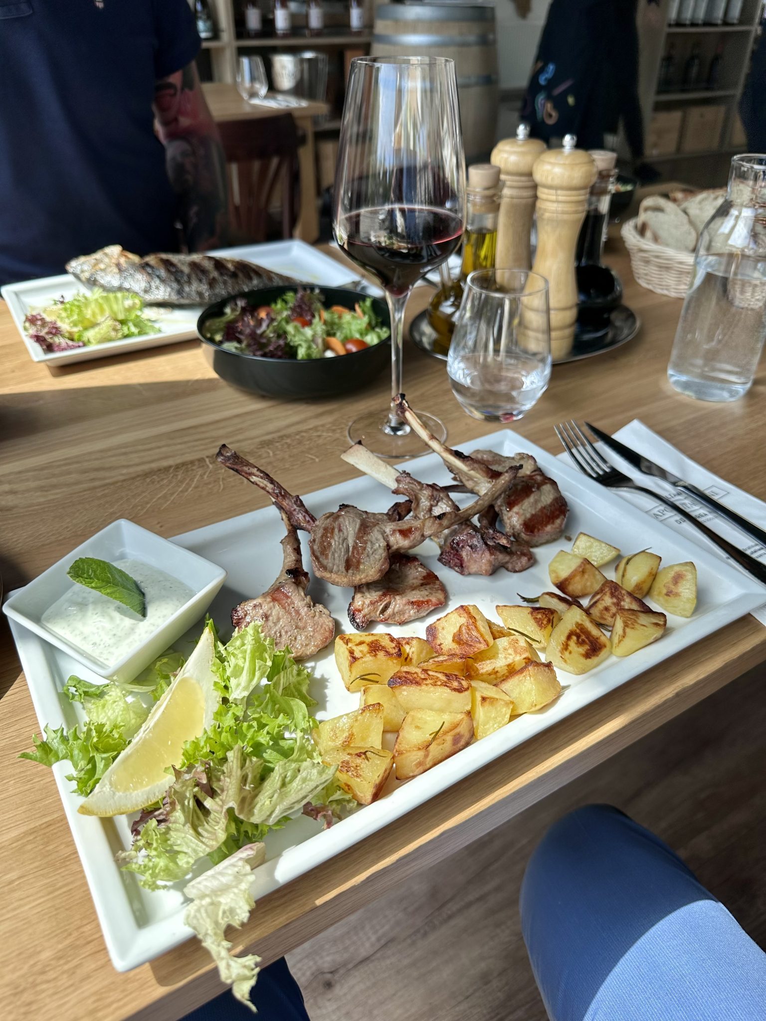 Jahňacie kotlety, ako zástupca mäsových chodov, opäť rozdúchali moju predstavivosť. Boli jednoducho, ale perfektne opečené, s rozmarínovými zemiakmi a mätovým dresingom. Cena 32 €. Prvá myšlienka viedla k chrumkavej pistáciovej kruste, vínovo maslovému demi glace či k parmezánovým zemiakom.