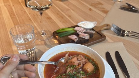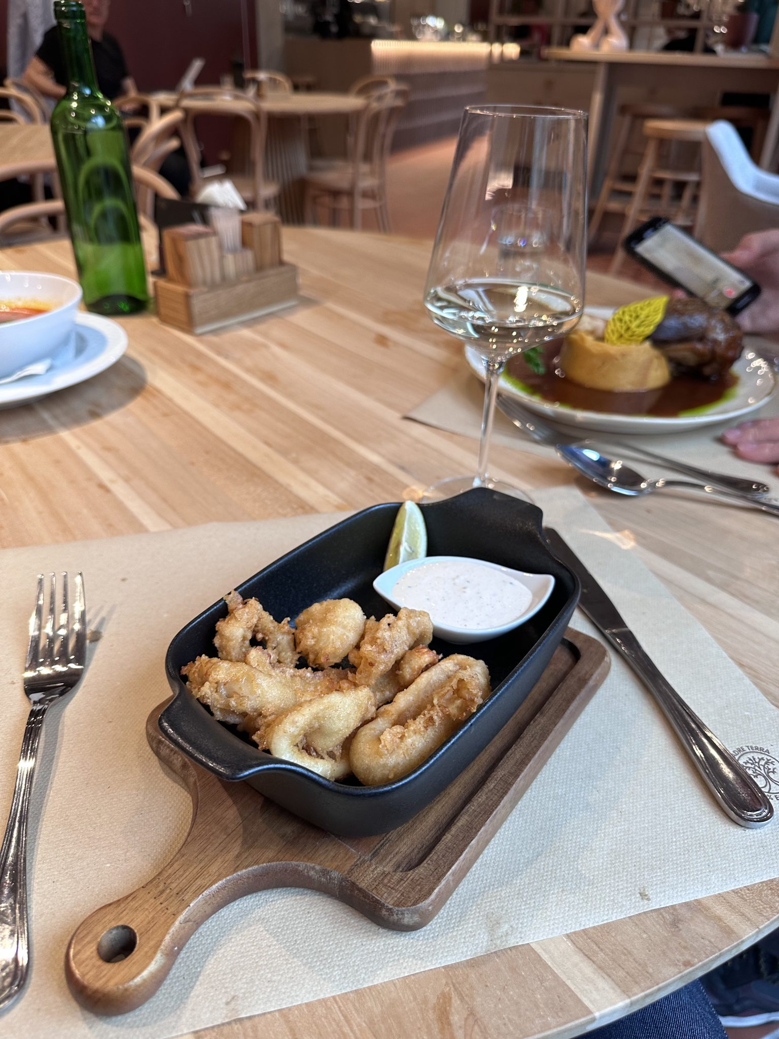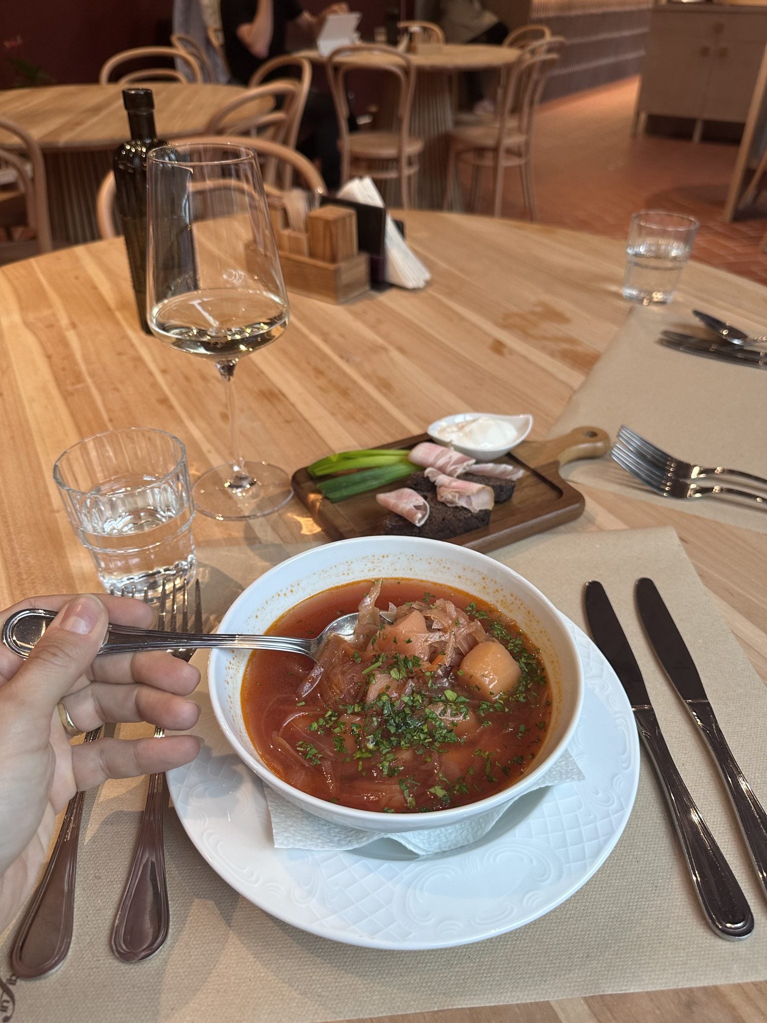 Vyprážané kalamáre boli dokonalo chrumkavé a vnútri presne na rozmedzí gumovosti a mäkkosti. Namáčajú sa do jednej z najlepších domácich tatariek, čo som za dlhú dobu jedol. Cena 10,2 €. Jednou z najlepších a najkrajšie servírovaných vecí bol Boršč. Viac takýchto jedál na lístok.