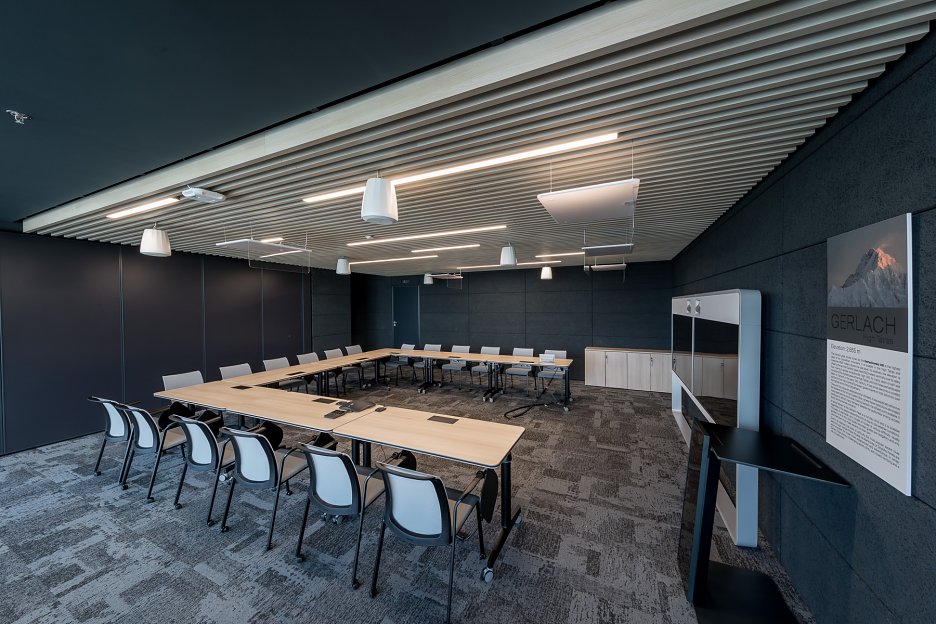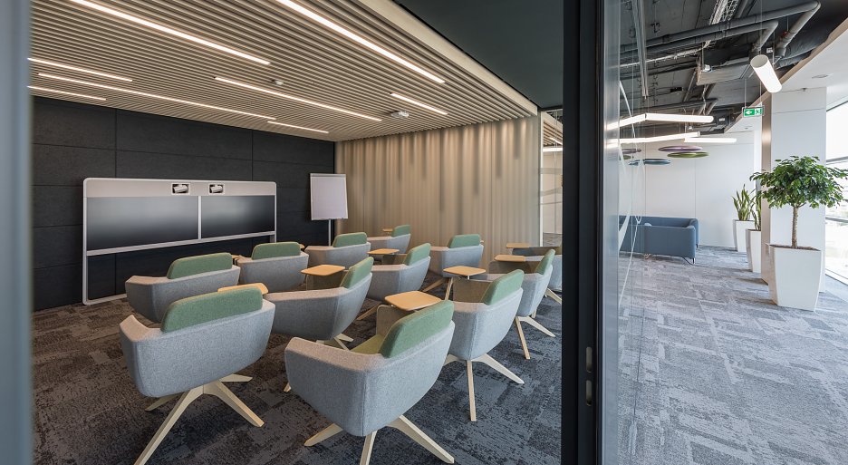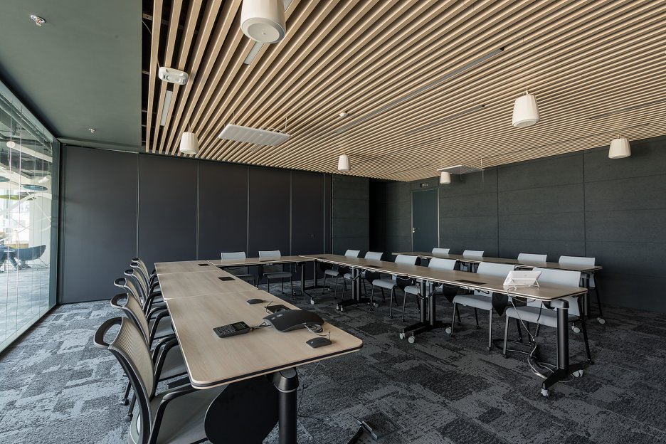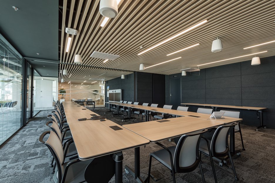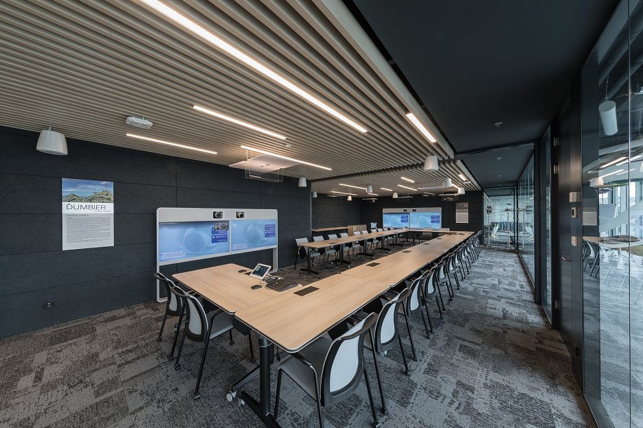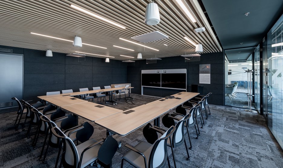 1. Technológia: V časti interiéru neboli použité podhľady, pod stropom je viditeľné vedenie rozvodov technológií. Do konceptu zapadajú aj materiály ako priemyselný koberec a akustické obklady zo striekaného heraklitu.