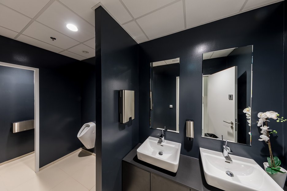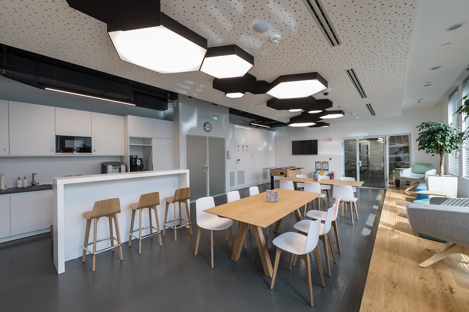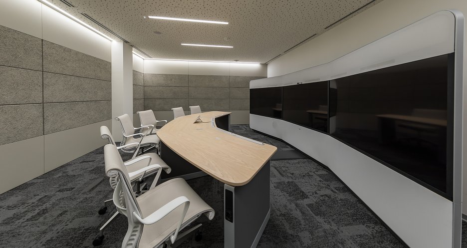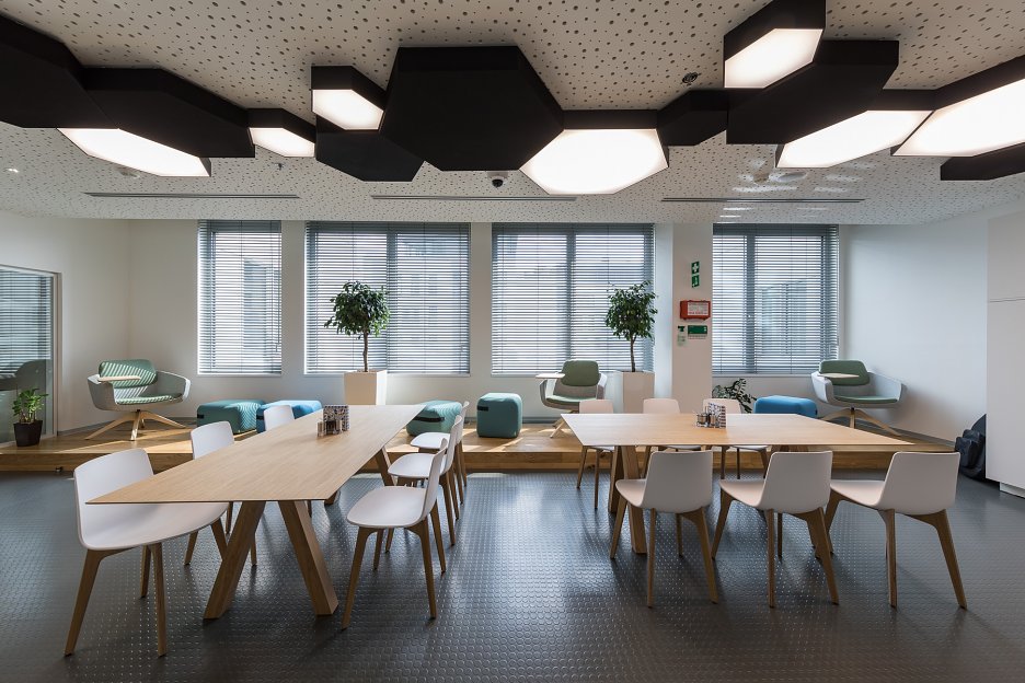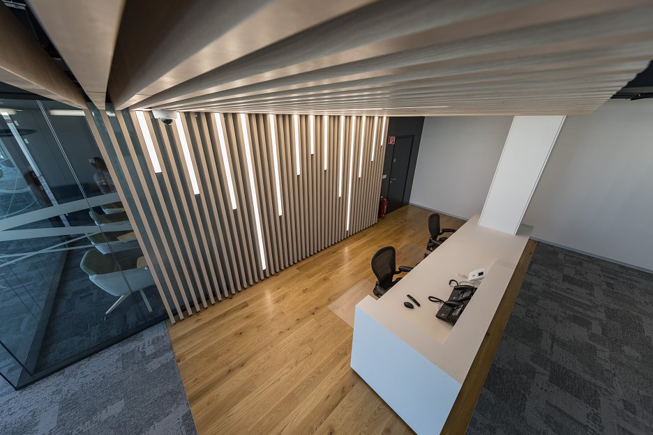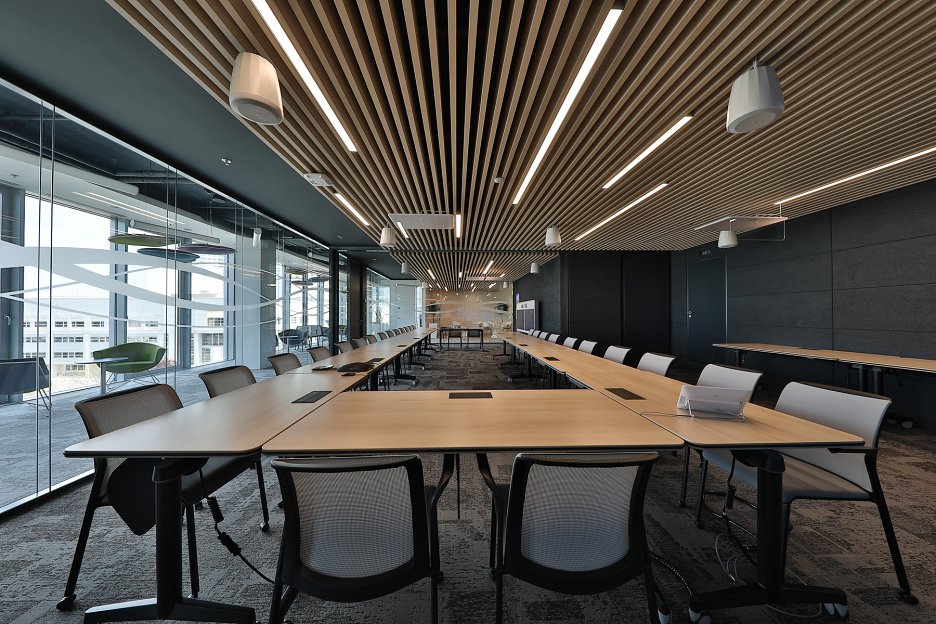 1. Technológia: V časti interiéru neboli použité podhľady, pod stropom je viditeľné vedenie rozvodov technológií. Do konceptu zapadajú aj materiály ako priemyselný koberec a akustické obklady zo striekaného heraklitu.