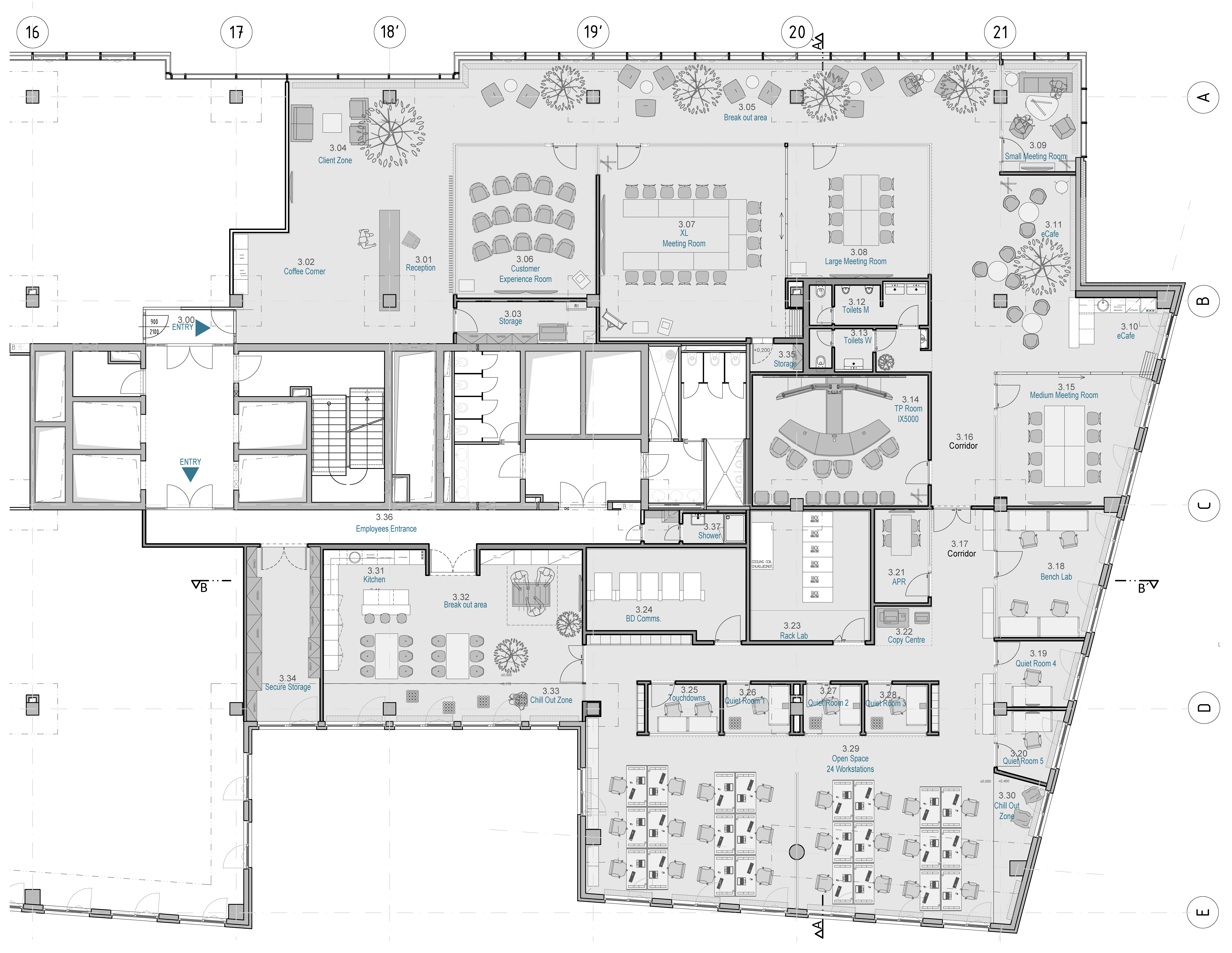 1. Technológia: V časti interiéru neboli použité podhľady, pod stropom je viditeľné vedenie rozvodov technológií. Do konceptu zapadajú aj materiály ako priemyselný koberec a akustické obklady zo striekaného heraklitu.