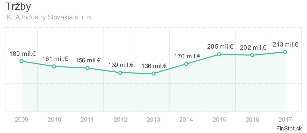 Spoločnosť IKEA Industry Slovakia s. r. o. v roku 2017 dosiahla tržby vo výške 212,89 miliónov eur, pričom podľa informácií Finstatu jej tržby medzi rokmi 2009 a 2013 pomaly klesali a až o rok nato zaznamenali mierny nárast.