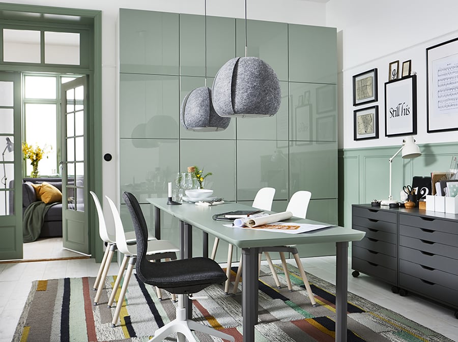 Ďalším slovenským produktom je nábytok pre kancelárske priestory. Ani tu IKEA nešetrila na variabilite, ktorá dovolí pohrať sa s priestorom. Od nás pochádza úložný nábytok s označením GALANT s dyhovaním, luxusný pracovný stôl BEKANT s nastaviteľnou výškou pre dvoch, ktorý disponuje aj odhlučnenou stenou spojenou s nástenkou.