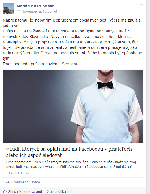 - Čo priniesla táto skúsenosť mne? Dostal som desiatky žiadostí o priateľstvo či množstvo nových followerov na twitteri aj na facebooku.Môj blog si získal nových fanúšikov