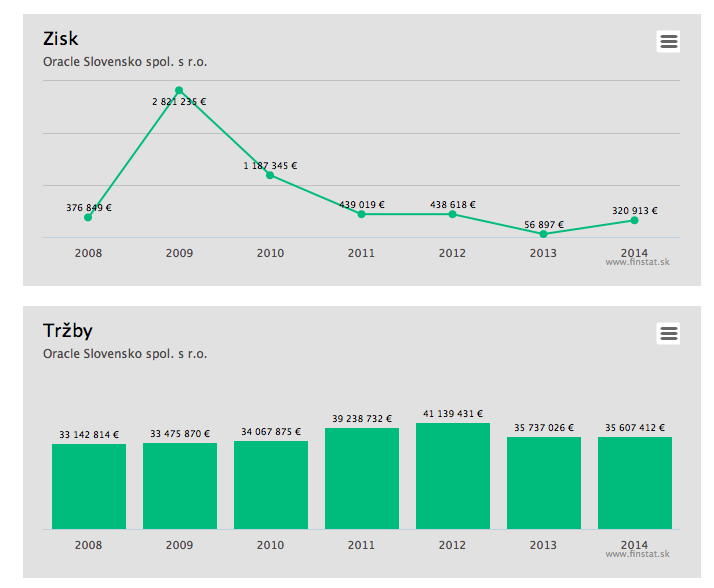 Tak napríklad: Slovenská pobočka Amazonu vykázala za rok 2014 tržby vo výške 16,3 milióna eur, zisk pritom uviedla na úrovni pol milióna eur. Ešte horšie s nami „vybabral“ Oracle. Ten na Slovensku vykázal tržby vo výške 35,6 milióna eur, zisk však mal údajne len 320 000 eur. Štátu tak odviedol pár desiatok tisíc eur. Pozri sa na graf, ktorý krásne ukazuje, kde pravdepodobne začala tzv. „optimalizácia daní“. Kým v roku 2009 sa zdalo, že firma zdaňuje relatívne poctivo, v roku 2013 to zašlo do extrémov.