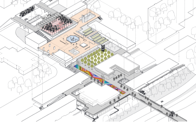 Výhodou námestia je, že je úplne oddelené od dopravy, keďže sa nachádza čiastočne na strechách objektov. Vďaka tomu mohli architekti využiť naplno potenciál miesta, ktoré slúži len chodcom.