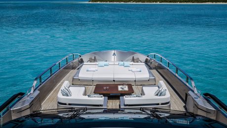 Exteriér jachty, navrhnutý Officina Italiana Design, očarí elegantnými líniami a nadčasovou siluetou. Trup z bieleho sklolaminátu s tmavými akcentmi vyžaruje čistotu a dynamiku, zatiaľ čo rozsiahle okná prelínajú interiér s exteriérom a ponúkajú úchvatné panoramatické výhľady.