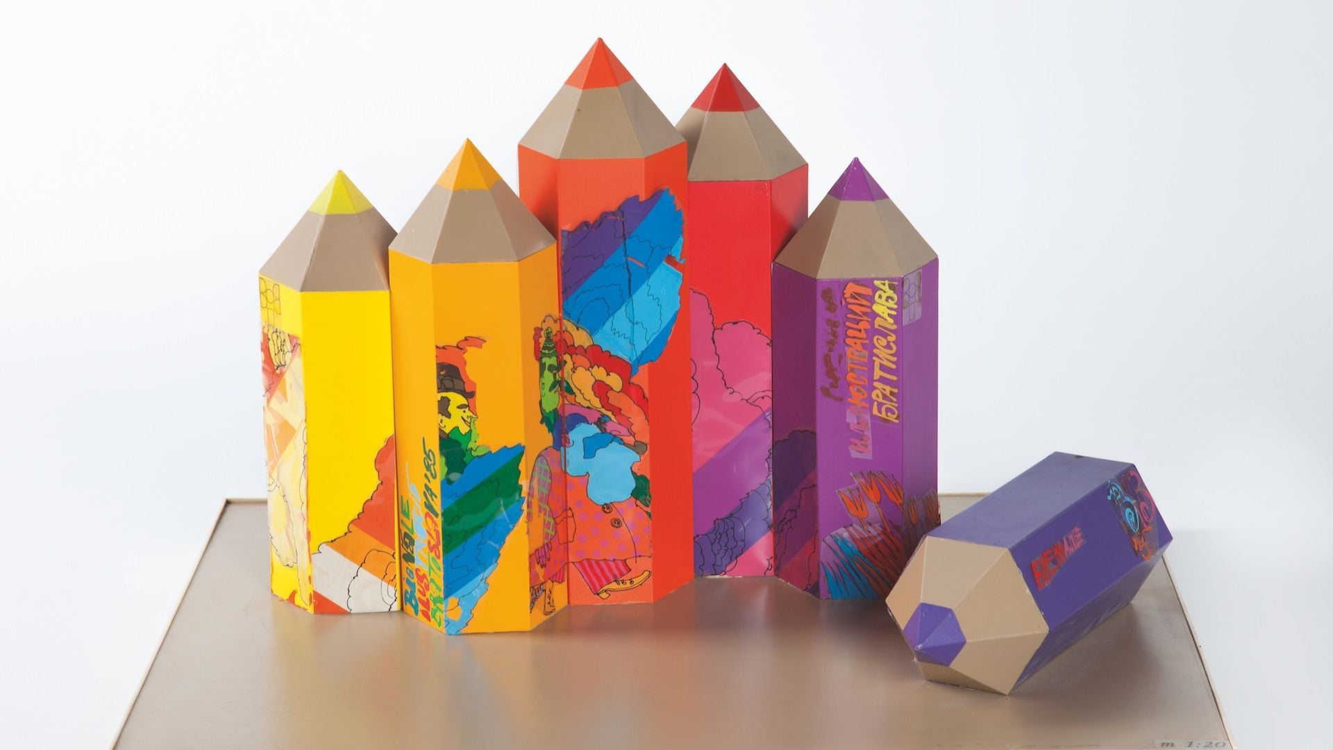 Práve od roku 1985 začali byť súčasťou BIB aj nadrozmerné exteriérové pútače v uliciach Bratislavy. Preto Milan Veselý oslovil na spoluprácu aj dvojicu architektov, Viktóriu Cvengrošovú a Virgila Droppu. Pracovali s jednoduchým základným motívom širokých farebných ceruziek v rôznych farebných a výškových variáciách, odkazujúc tak na tvorbu pre deti bez hraníc. Ceruzky sú na hranách pokreslené veselými ilustrovanými postavičkami a značkami BIB.