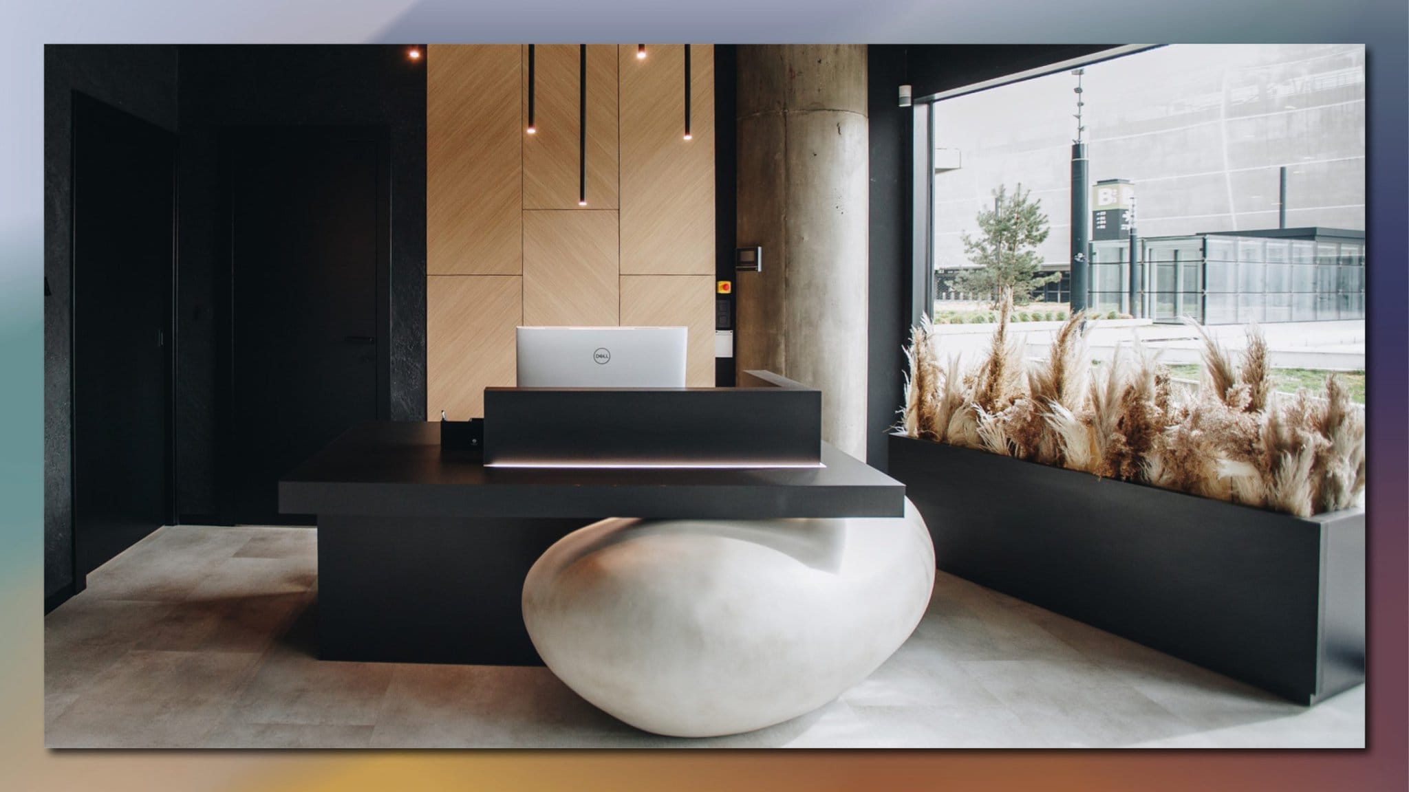 PESCHLOVÁ PODHORSKÁ advokátska kancelária, s. r. o. – kancelárie majú dobrú dostupnosť a vyhovujúcu veľkosť. Monochromatická farebná schéma interiéru nevyrušuje klientov, ktorí sa cítia komfortne, bezpečne a zvyšuje sa ich dôvera k službám kancelárie. Jedinečnými prvkami sú kameň ako súčasť recepčného stola a kvety pampasu.