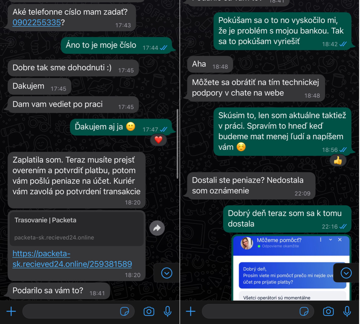 Veci sa však začali komplikovať po tom, čo kupujúca poslala obeti link spoločnosti „Packeta“, prostredníctvom ktorého mala overiť platbu. Ako nám predávajúca vysvetlila, najprv jej daný odkaz nefungoval, v dôsledku čoho kontaktovala zákaznícky servis.