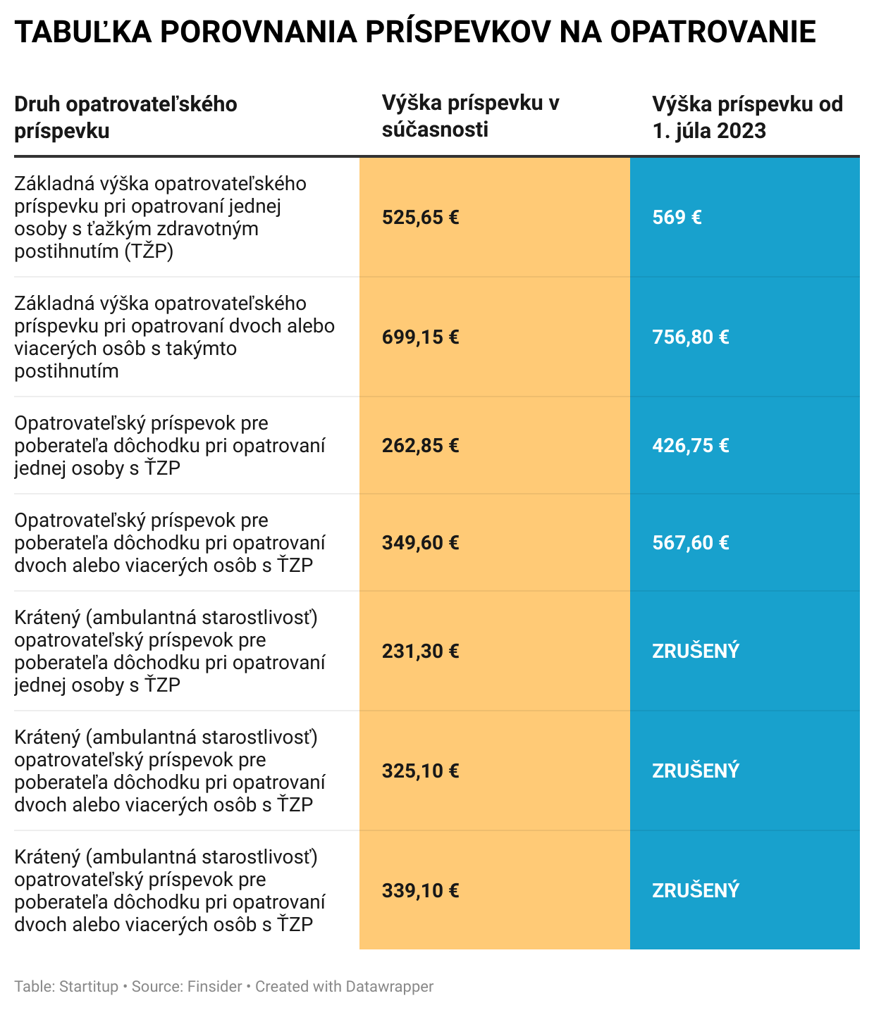 Zmenou od júla by mala osoba v produktívnom veku pri opatrovaní jednej osoby poberať 569 eur mesačne, pri opatrovaní dvoch a viac osôb bude jej príspevok už 756,80 eur mesačne. Opatrovatelia môžu dostať ešte o sto eur navyše, ak je opatrovanou osobou s ŤZP jedno či viac nezaopatrených detí a opatrovateľ nemá príjem zo zamestnania, nepoberá žiadne dôchodkové dávky, penziu z druhého piliera, alebo dávky výsluhového zabezpečenia.