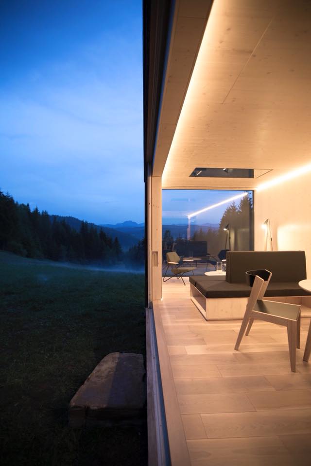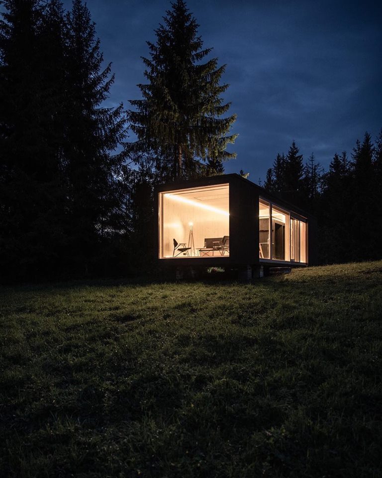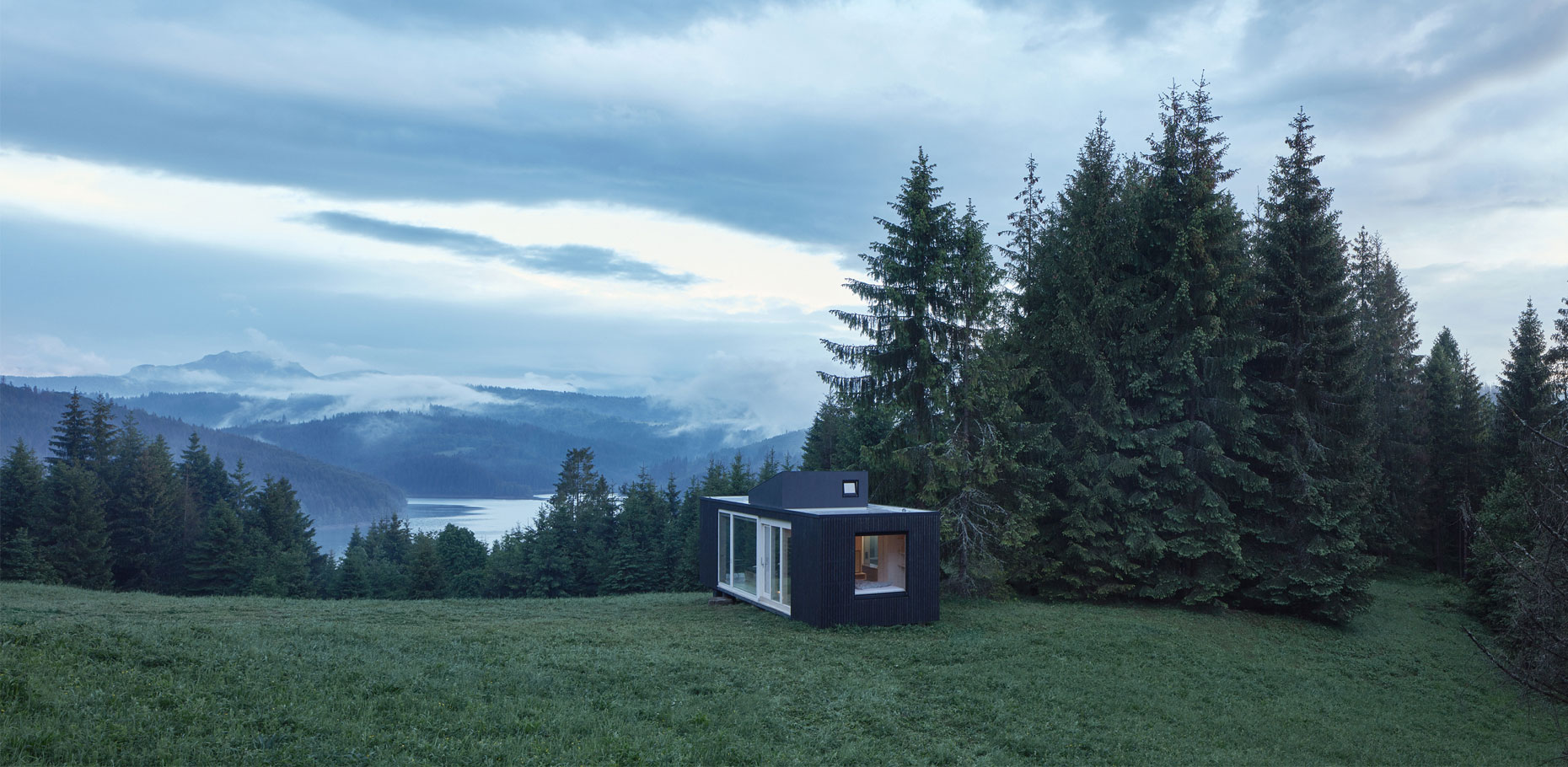 Objekt na lúke, v blízkozti brehu vodnej nádrže Nová Bystrica, predstavuje riešenie, ktoré vzniklo „na kľúč“ s plne zariadeným interiérom podľa požiadaviek klienta. Čo sa týka priestoru, ten je v tomto prípade celkom flexibilný a z obmedzenej obytnej plochy ťaží maximum. Zaujímavé je, že táto stavba nemá pevné základy, nie je napojená na siete a konštrukcia je na rozdiel od ostatných podobných projektov celodrevená, vrátane nosného rámu.