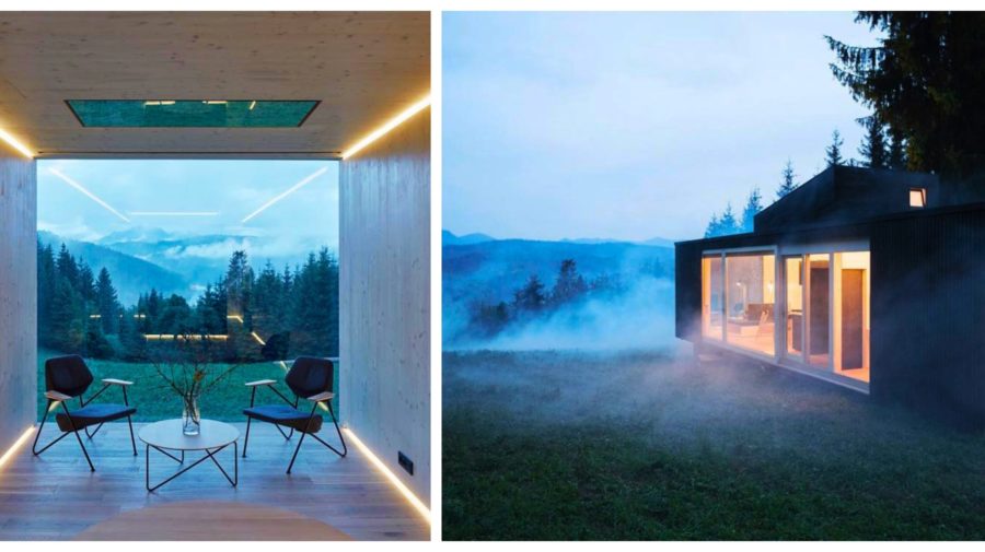 Otvory vo všetkých piatich fasádach, „rámujú“ pohľady ako scénické hry prírody a premietajú ich do interiéru. Či už ide o otváraciu stenu, ktorá fyzicky vpúšťa prírodu do interiéru, predné vykonzolované zasklenie, či kúpeľnovú stenu s mliečnym sklom, na ktorej sa odohráva tieňohra dotýkajúcich sa konárov a meniacich sa siluét lesa. Azda najzaujímavejšie je horizontálne presklenie skyboxu, v ktorom máš pri zaspávaní pocit, že si vonku pod holým nebom.