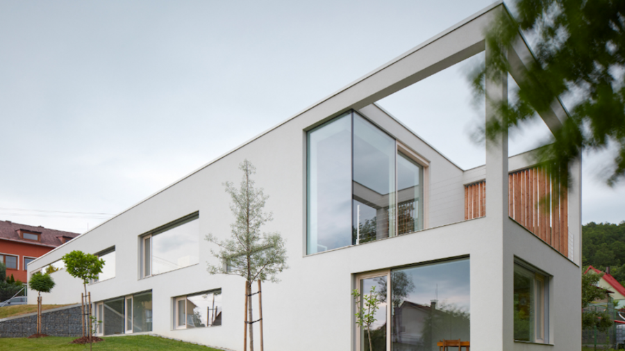 Zobraziť celú galériu (27)Architekti sa snažili aj napriek značným rozmerom novostavby o jej vhodné osadenie do svahovitého pozemku. Časť domu je pod terénom, všetky priestory vrátane terasy sú zakomponované v rámci jedného kubického objemu.