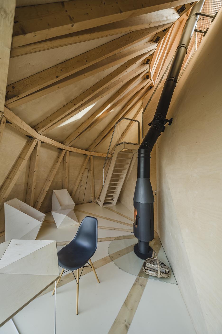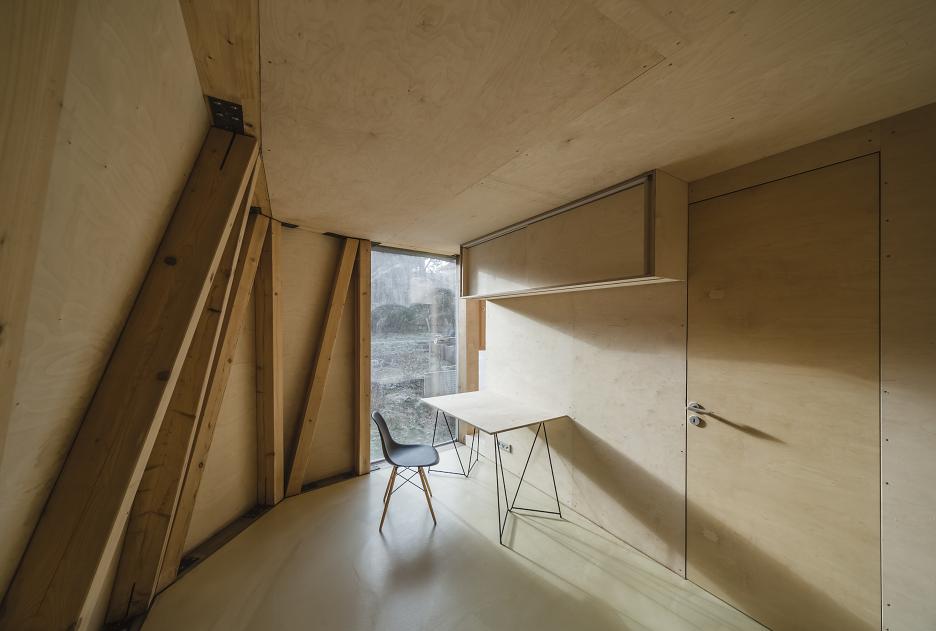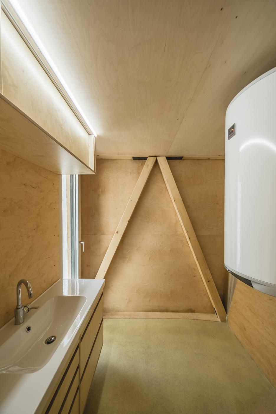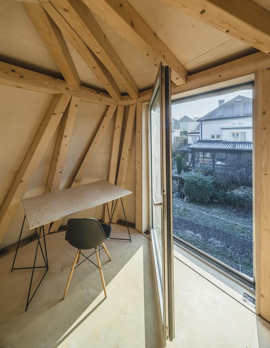V interiéri je priznaná nosná trámová konštrukcia a preglejkové dosky.
