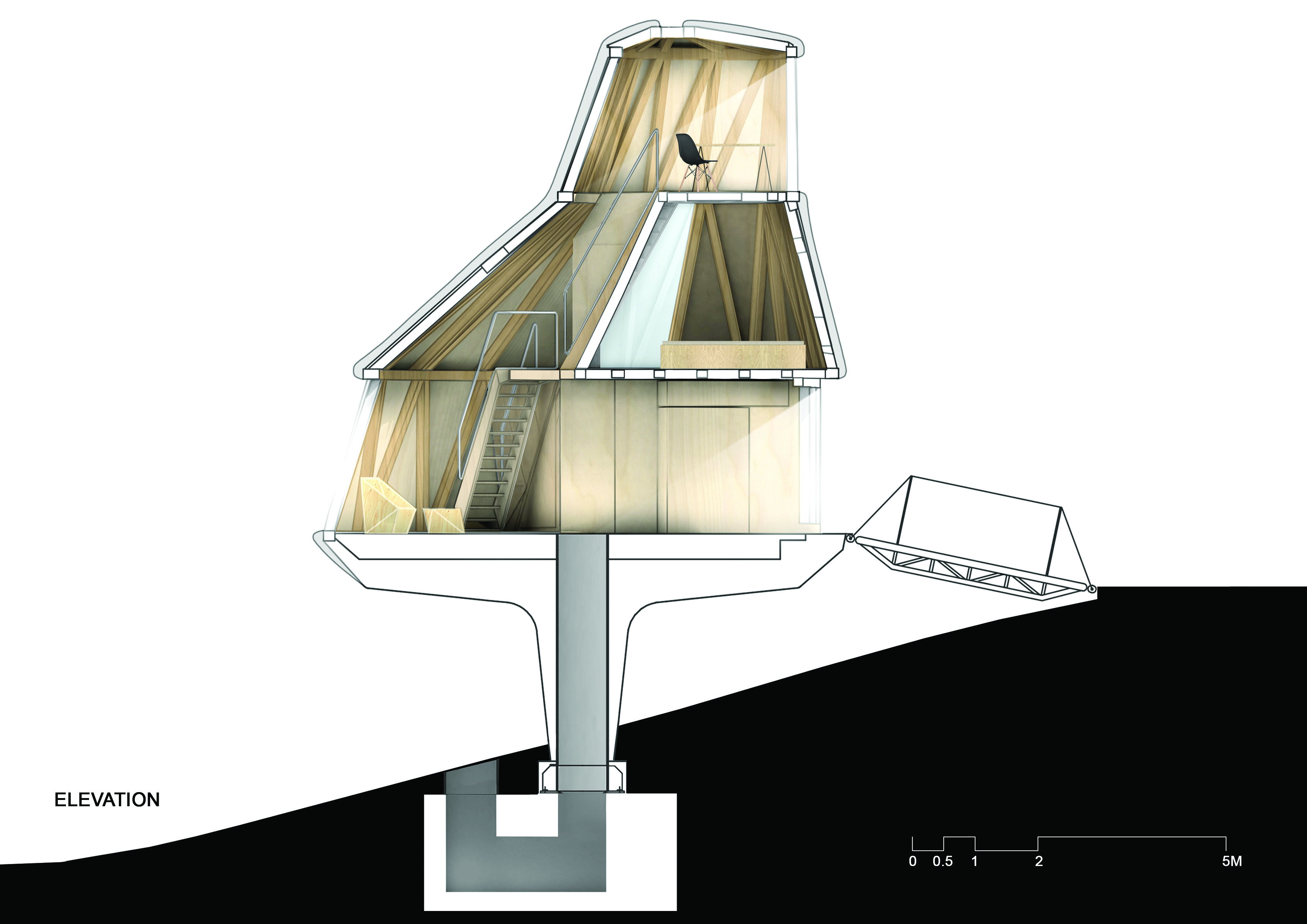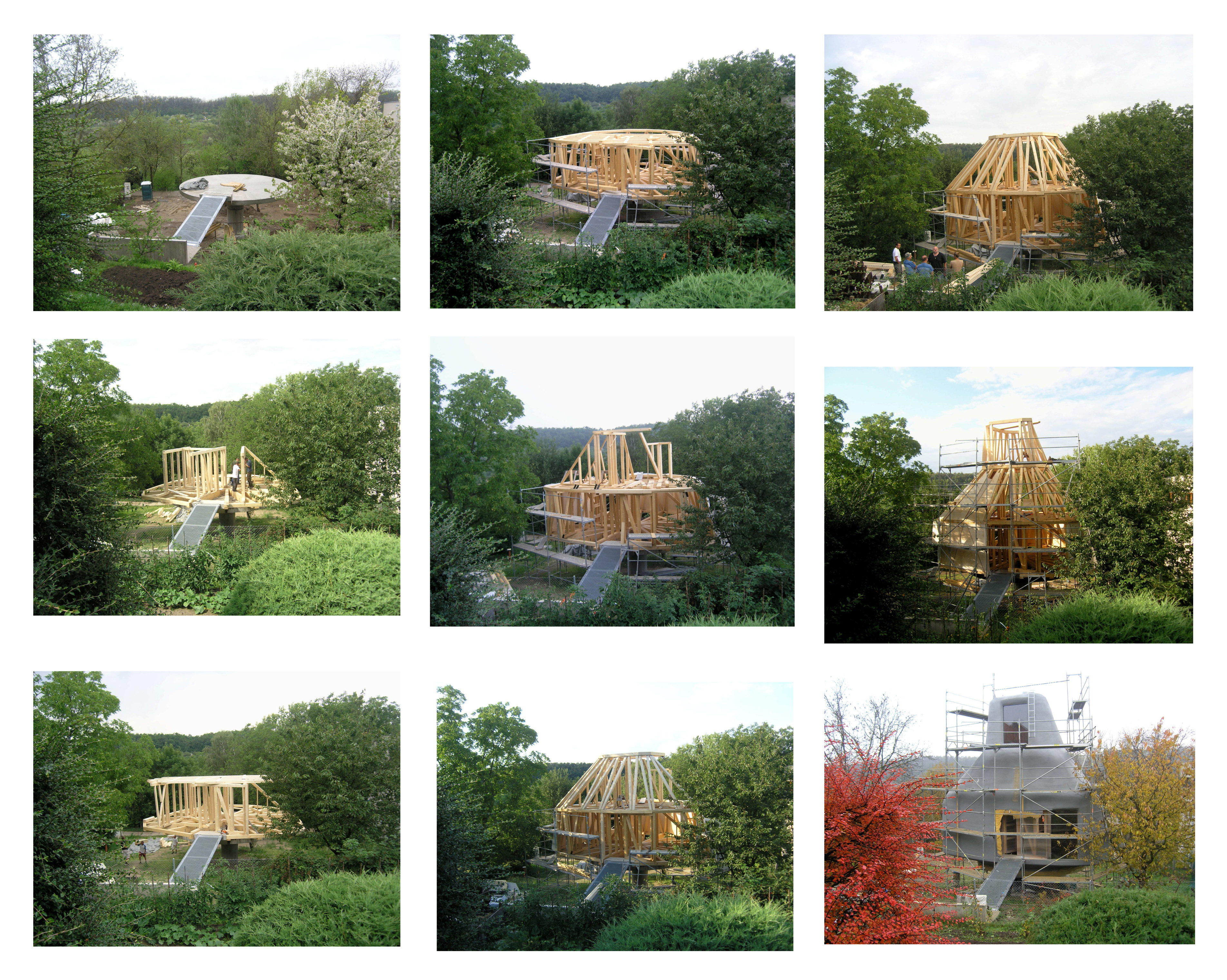 Trámová drevenú konštrukciu tvoria prvky vyrezávané na 3D frézke. Medzi trámy je z vonkajšej strany priskrutkovaná preglejka hrúbky 18 mm. Na túto vrstvu sa nastriekala polyuretánová tepelná izolácia. Toto riešenie je lacné a má dobré tepelnoizolačné vlastnosti. Vodeodolnosť povrchu je zabezpečená akrylátovou vrstvou.