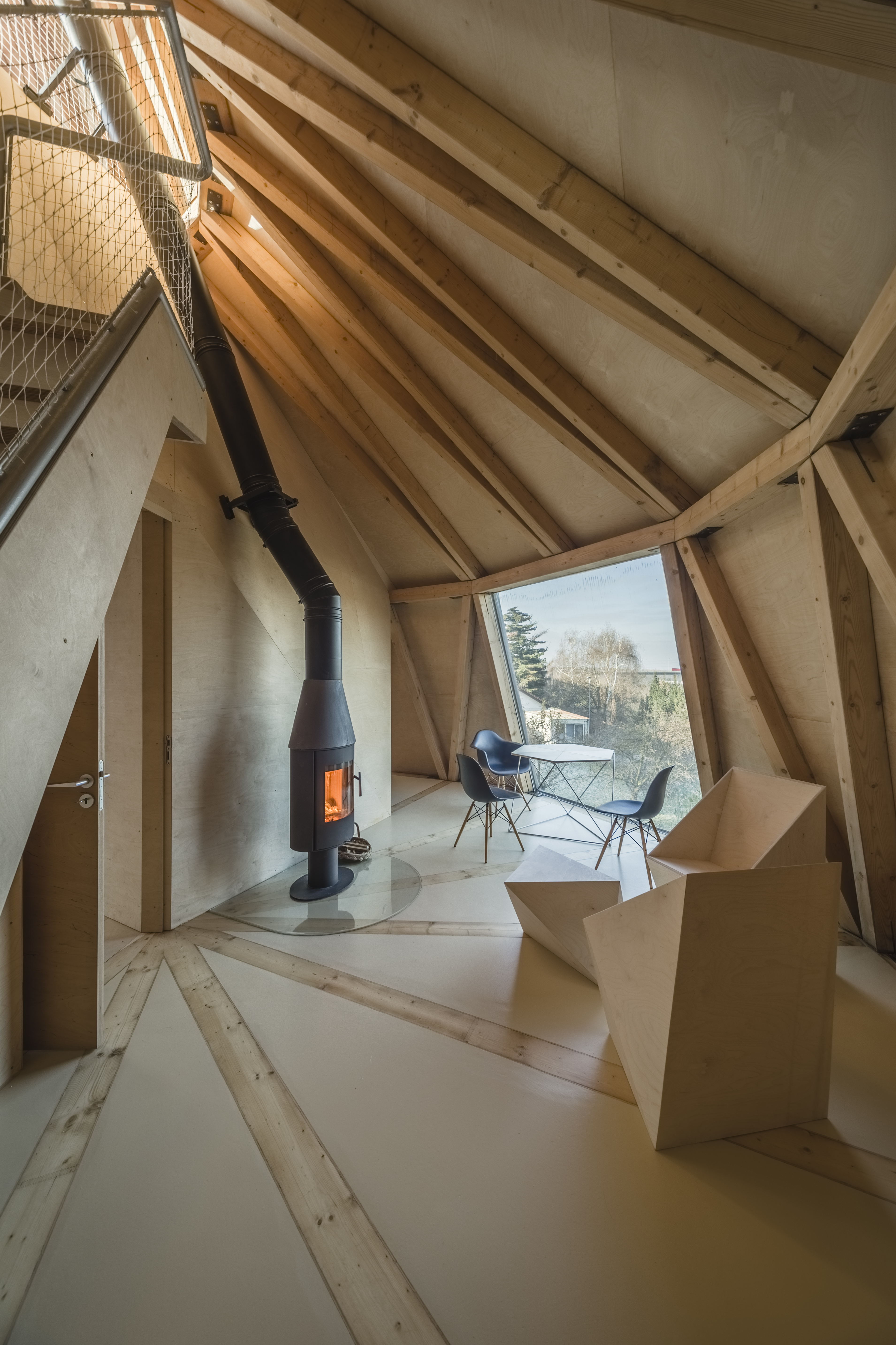 V interiéri je priznaná nosná trámová konštrukcia a preglejkové dosky.
