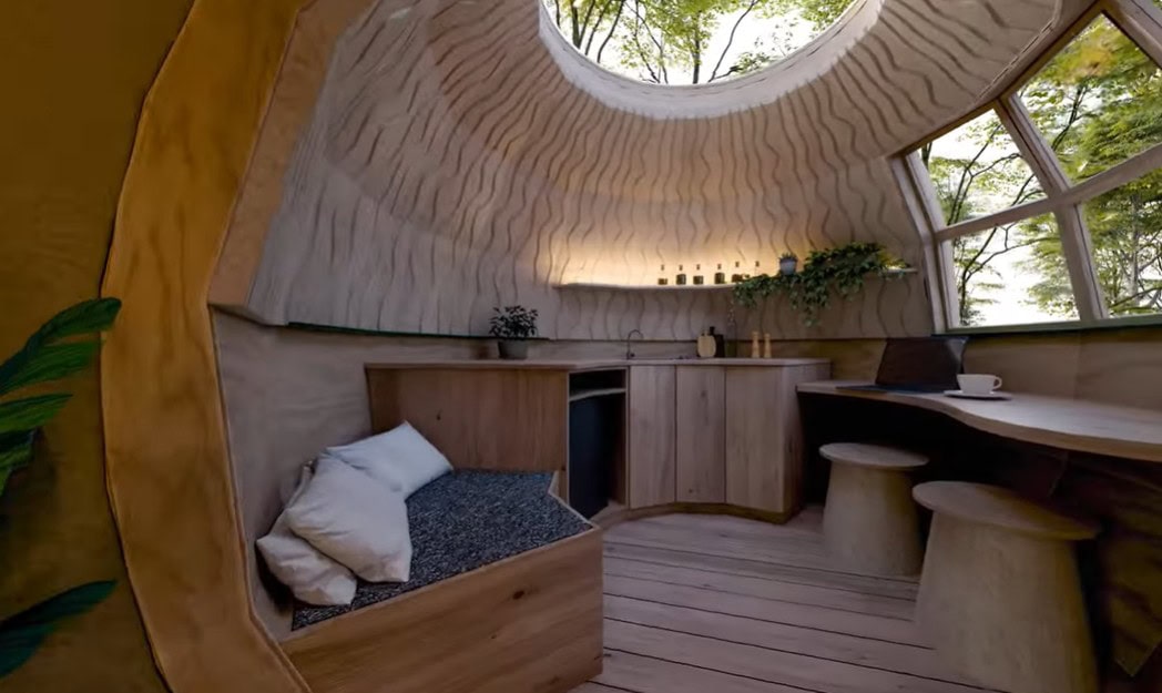 Dom tvoria okrúhle bunky prepojené s chodbou. Tri metre široká a viac než sedem metrov dlhá konštrukcia umožňuje jednoduchú prepravu. V budúcnosti sa vydá na cestu po Česku, aby predstavil ekologický prístup k bývaniu, a neskôr poslúži ako glampingové ubytovanie.