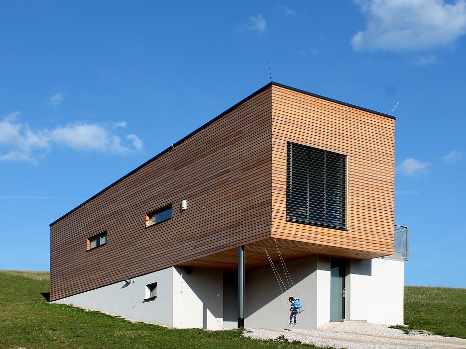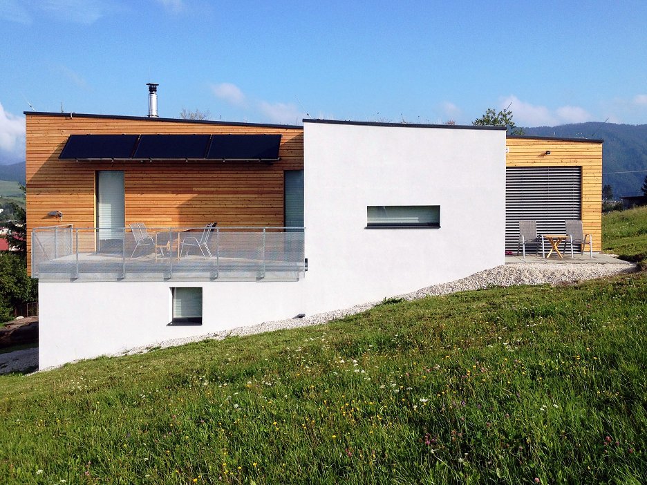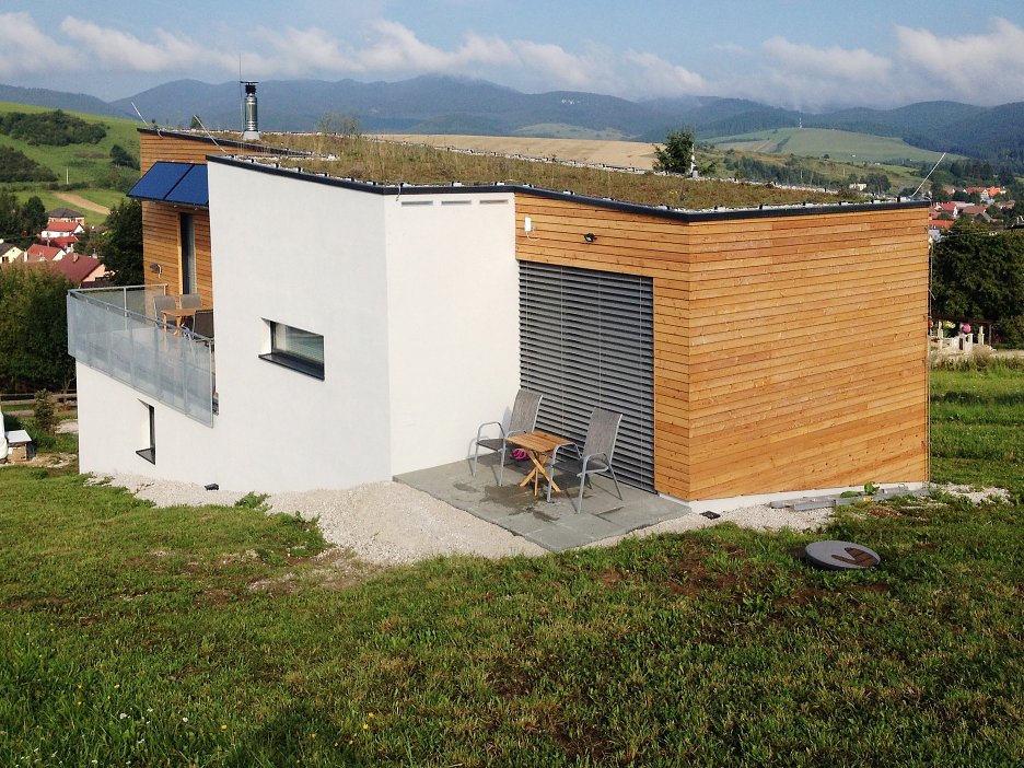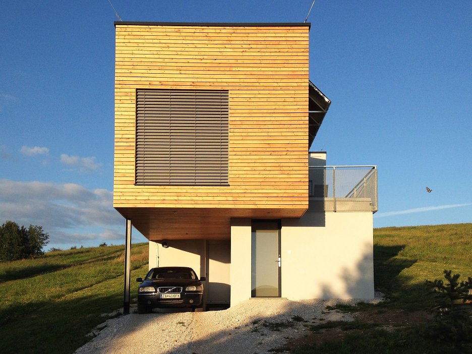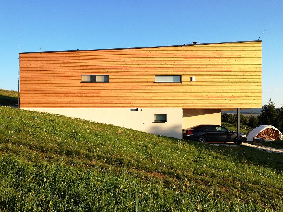 - Úzky svahovitý pozemok s atraktívnym výhľadom predurčil formu malého drevodomu. Osadenie vyžadovalo minimálne úpravy terénu. Dom Je navrhnutý pre štvorčlennú rodinu s minimálnymi nárokmi na priestor, ale s vysokými nárokmi na kvalitu bývania.