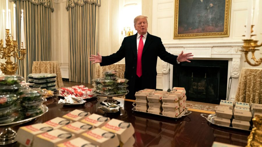 Donald Trump sa pripravil na návštevu univerzitných šampiónov v americkom futbale skutočne nezvyčajne – namiesto plnohodnotného jedla svojim hosťom v Bielom Dome objednal vyše 300 hamburgerov z McDonalds, Burger Kingu či Wendys, a pizzu z Domino’s pizza. Večera sa konala v 140-miestnej jedálni, ktorá bežne hostí formálne večere pre ambasádorov alebo dôležitých politikov.