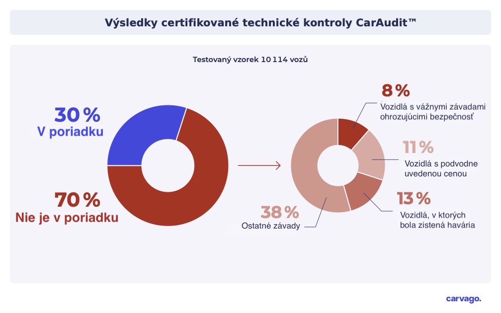 Až 70 % ojazdených automobilov určených v Európe na predaj nespĺňa technické štandardy. Až 20 % testovaných áut malo také závady, že boli nepredajné a nemajú na cestách čo hľadať. Vyplýva to z rozsiahleho prieskumu spoločnosti Carvago.
