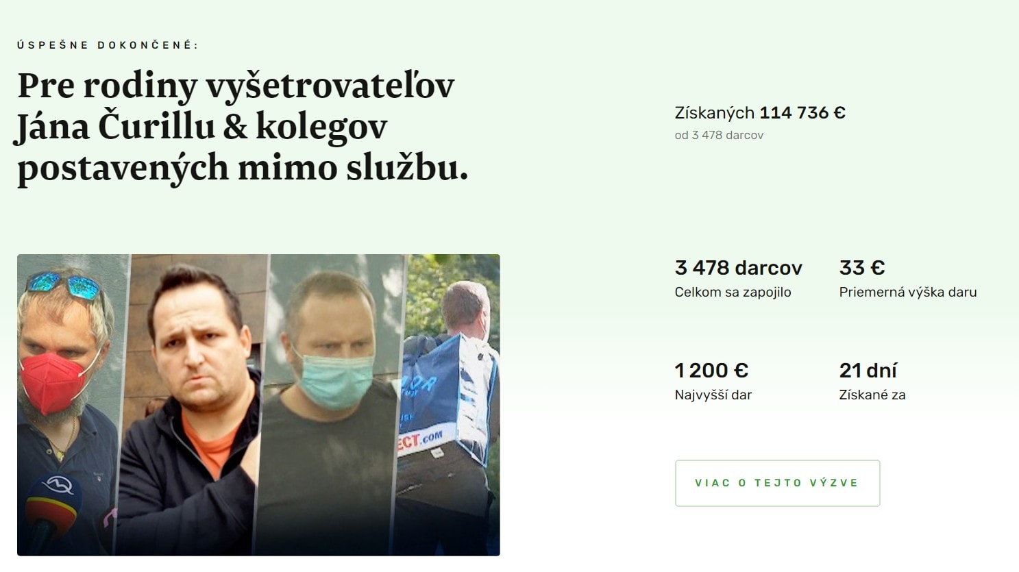 Za 21 dní vyzbierali ľudia pre rodiny vyšetrovateľov viac ako 100-tisíc eur. Presne 114 736 eur, na ktoré sa vyskladalo 3 478 ľudí. Najvyšší dar od jednej osoby bol 1 200 eur.