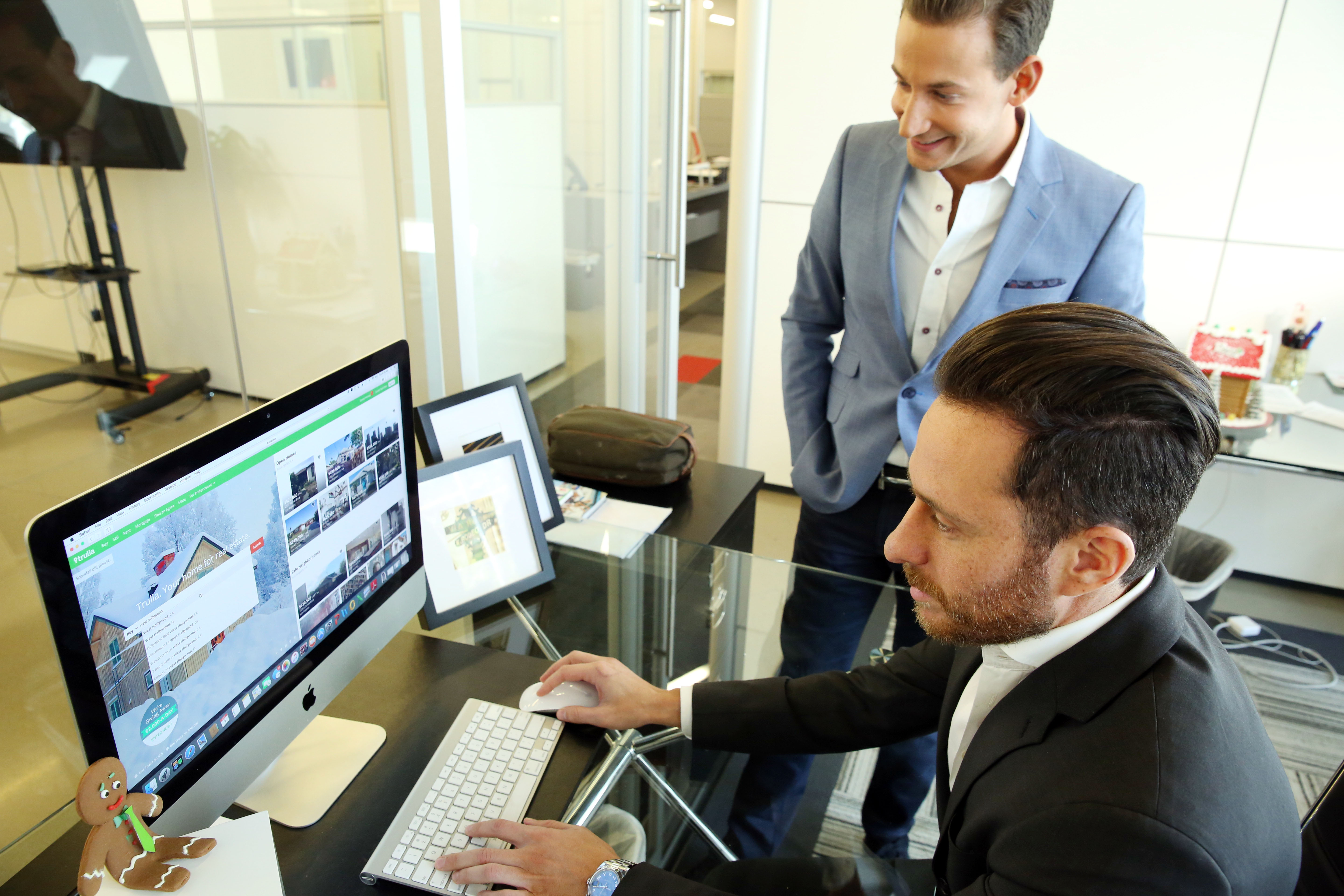Celebrity real estate agents David Parnes, right, and James Harris from Bravo TV’s “Million Dollar Listing Los Angeles” partner with Trulia to help their newest client – the Gingerbread Man – find a dream home for his growing family. The pair have only 12 days to complete the challenge, which kicked off on Tues., Dec. 1, 2015 in Beverly Hills, Calif. (Photo by Matt Sayles/Invision for Trulia/AP Images)