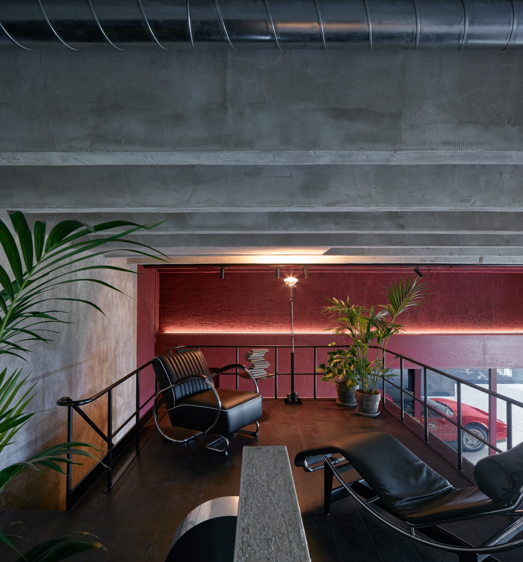 Panuje tu uvoľnená atmosféra s pohovkou, konferenčným stolíkom a geometrickou knižnicou. Formálnosti sa tu odkladajú bokom. Je tu veľkoformátové okno, presklené dvere a kedykoľvek je možné prejsť na verandu a priestor sa tak rozširuje. Červený neón pridáva na uvoľnenej atmosfére a má navodiť atmosféru jazdy nočným neznámym veľkomestom.