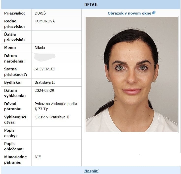 Jej meno od včerajšieho dňa, teda od 29. februára 2024, svieti medzi najhľadanejšími zločincami Slovenska. V systéme PATROS je fotografia známej exfarmárky s celým menom Nikola Ďuriš Komorová, dátum jej narodenia, vyhlasujúci útvar, ktorý zatykač na Komorovú vydal. V tomto prípade je to Okresné riaditeľstvo Policajného zboru Bratislava 2. No a nechýba ani dôvod vyhláseného pátrania, ktorý je v tomto prípade – Príkaz na zatknutie podľa § 73 Trestného poriadku.