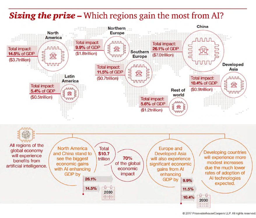 Podľa štúdie PwC by rozšírenie umelej inteligencie mohlo zvýšiť svetové HDP do roku 2030 až o 14 %, čo predstavuje až 15,7 biliónov dolárov, čo z umelej inteligencie robí najväčšiu komerčnú príležitosť dnešnej doby. Štúdia vyšla v roku 2017 a skúma biznis príležitosti v oblasti.