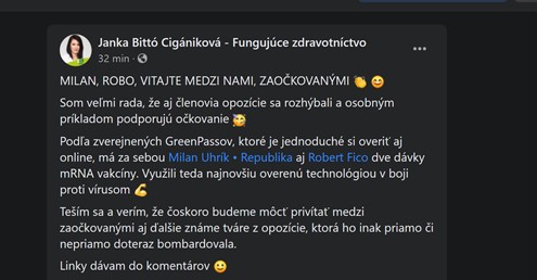 „Som veľmi rada, že aj členovia opozície sa rozhýbali a osobným príkladom podporujú očkovanie,“ teší sa v statuse, ktorý medzičasom vymazala, Janka Bittó Cigániková.