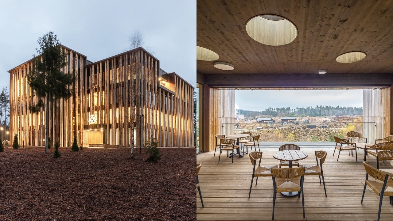 Budova vysoká 19-metrov sa nachádza uprostred lesa a zaujme už na prvý pohľad, a to aj napriek tomu, že perfektne zapadá do okolia. Fasádu budovy tvorí viac druhov dreva, ktoré architekti využili aj pri tvorbe interiéru. Ide o prvý administratívny prvok tejto spoločnosti nachádzajúci sa v lese, no určite nebude posledný.