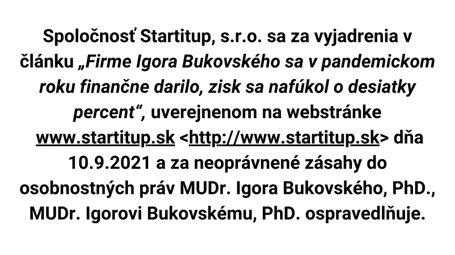 Spoločnosť Startitup, s.r.o. sa za vyjadrenia v článku „Firme Igora Bukovského sa v pandemickom roku finančne darilo, zisk sa nafúkol o desiatky percent“, uverejnenom na webstránke www.startitup.sk <http://www.startitup.sk> dňa 10.9.2021 a za neoprávnené zásahy do osobnostných práv MUDr. Igora Bukovského, PhD., MUDr. Igorovi Bukovskému, PhD. ospravedlňuje.