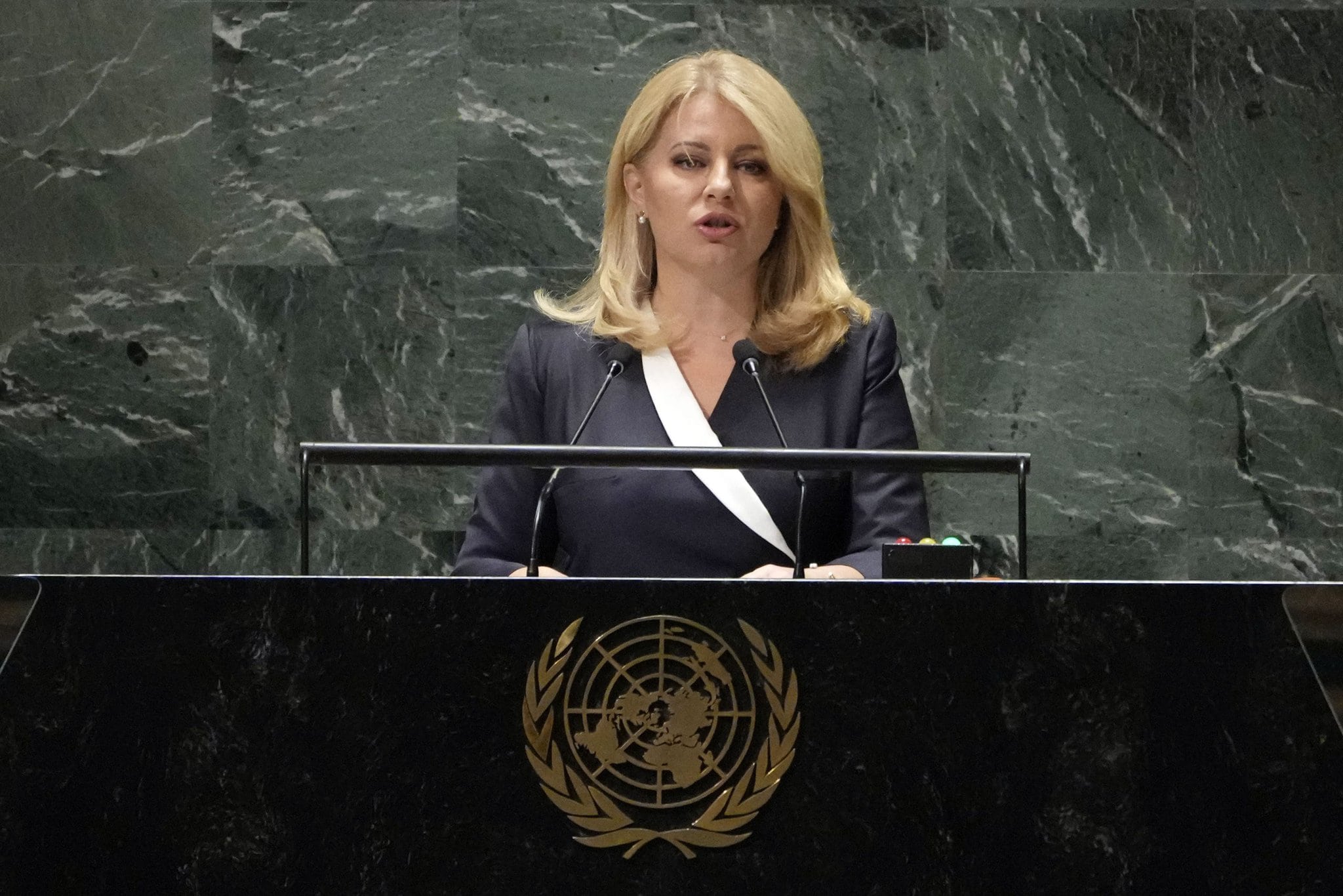 Slovenská prezidentka Zuzana Čaputová reční počas rozpravy na 78. zasadnutí Valného zhromaždenia Organizácie Spojených národov