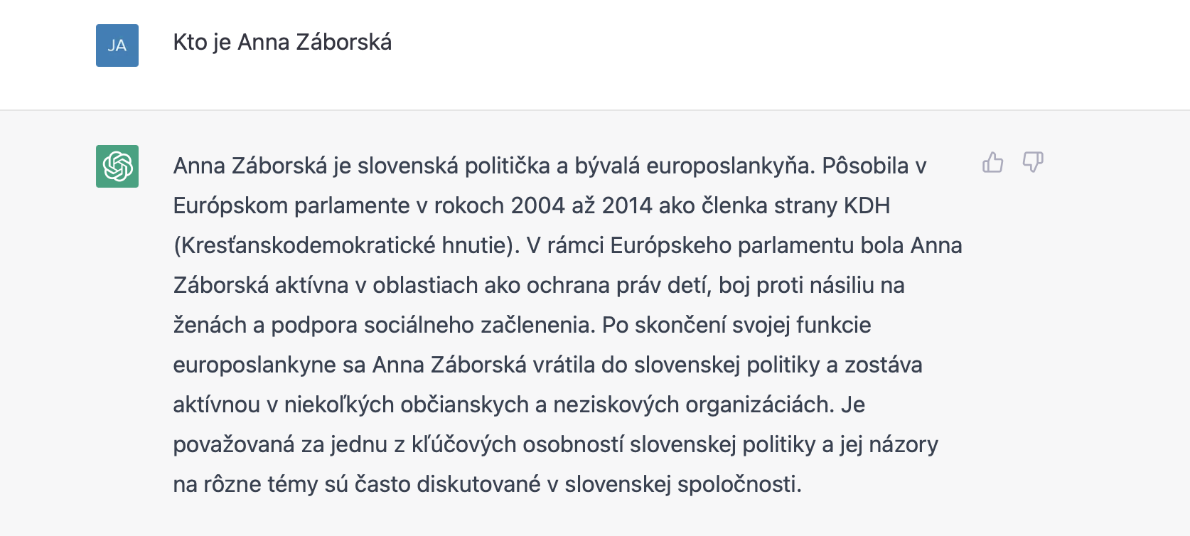 V tomto prípade spravil chatGBT chybu pri konkrétnych rokoch, počas ktorých Záborská pôsobila v europarlamente.