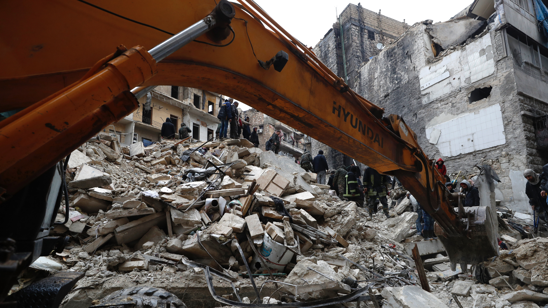 Pracovníci sýrskej civilnej obrany a bezpečnostné sily prehľadávajú trosky zrútených budov v sýrskom Aleppe.