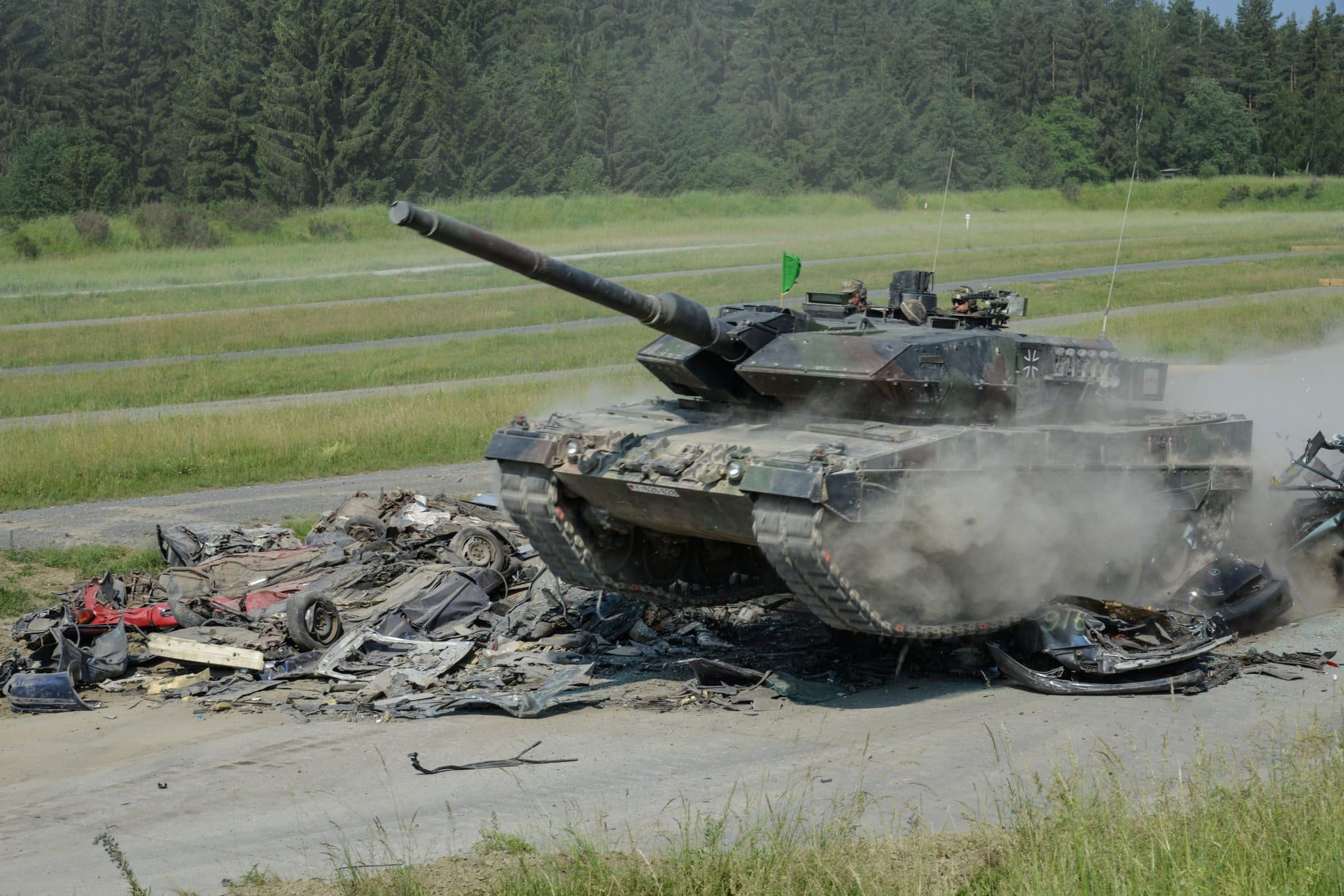 Nemeckí vojaci operujú tank Leopard 2A6 počas cvičenia Strong Europe Tank Challenge v Nemecku.