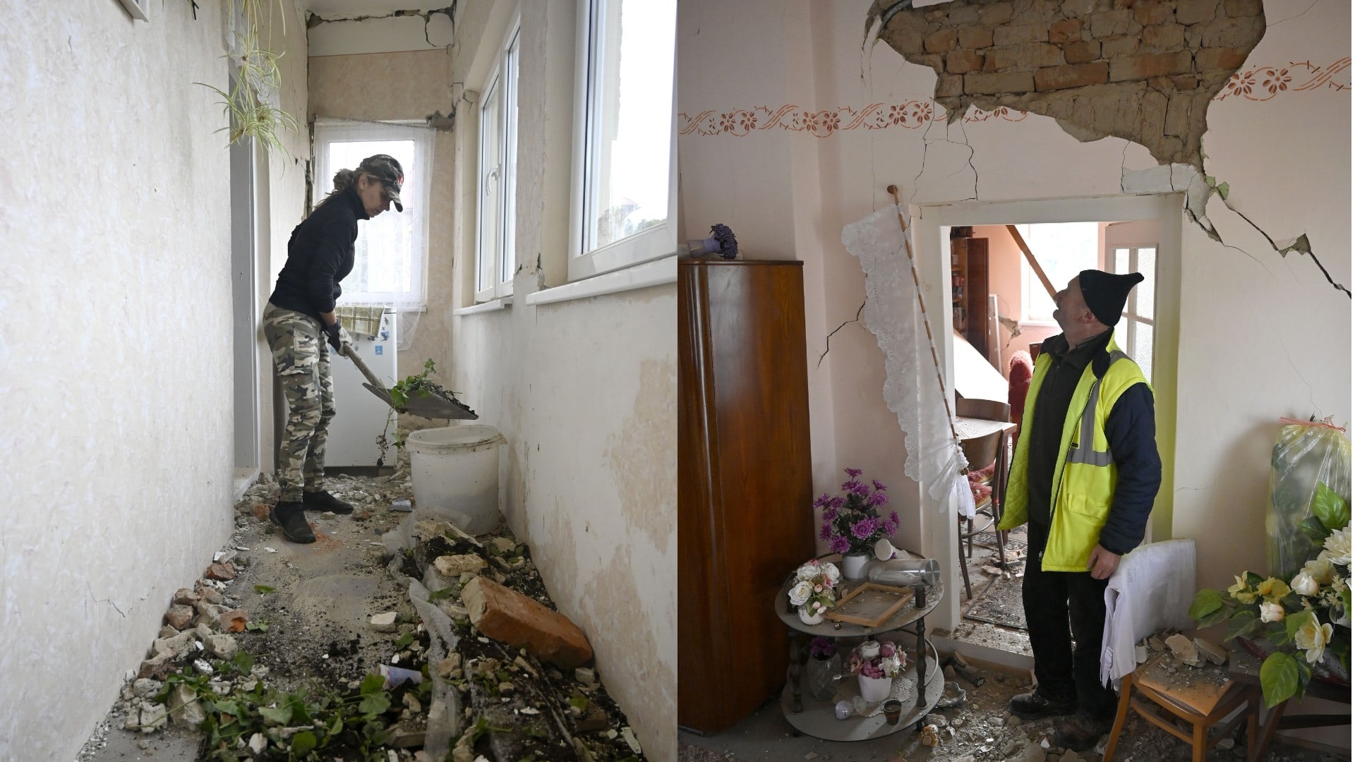 Na fotke jeden z obyvateľov Baškoviec, ktorý upratuje škody po večernom zemetrasení.