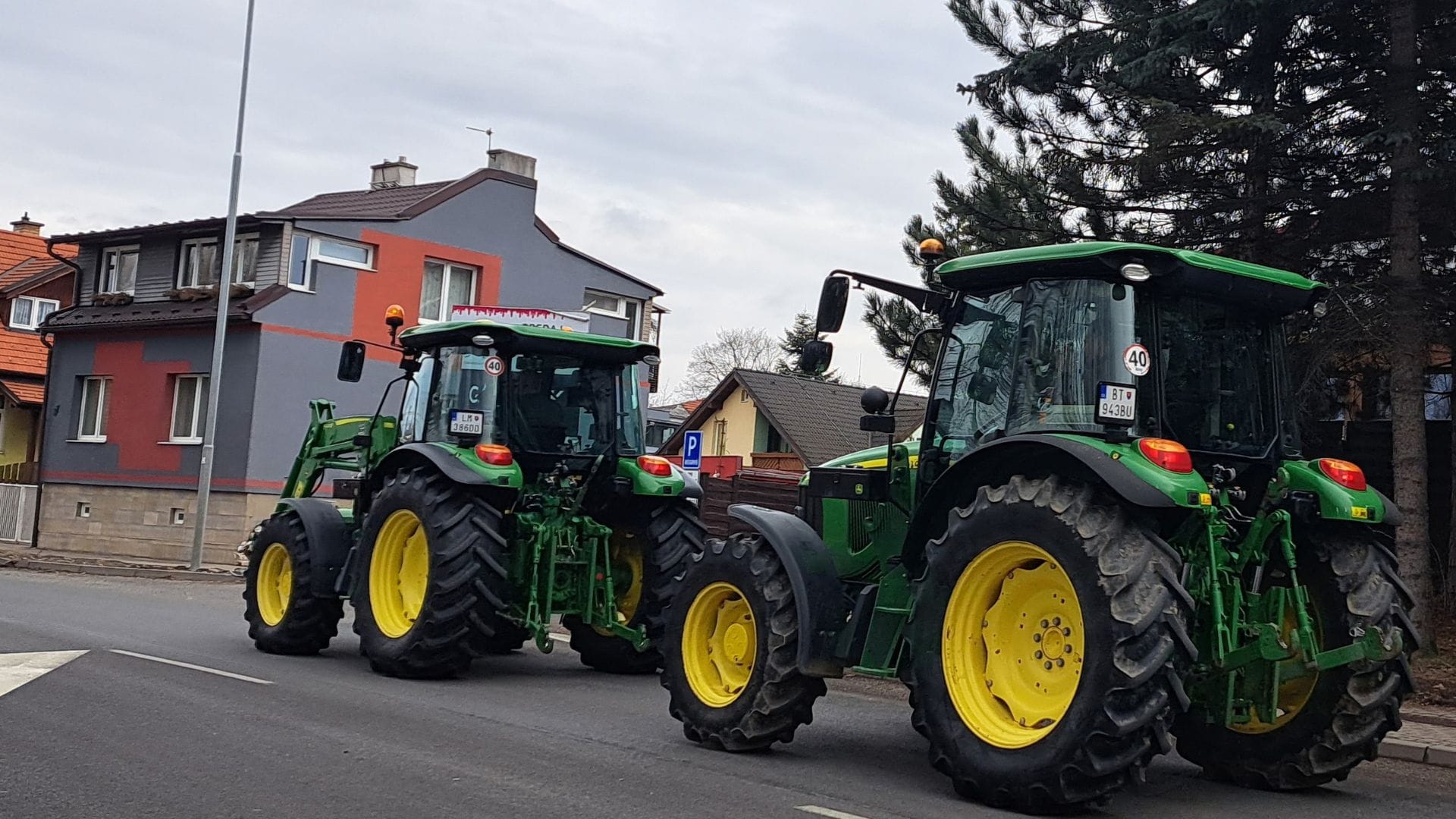 Na snímke farmári protestujú na hlavnom ťahu v Poprade.