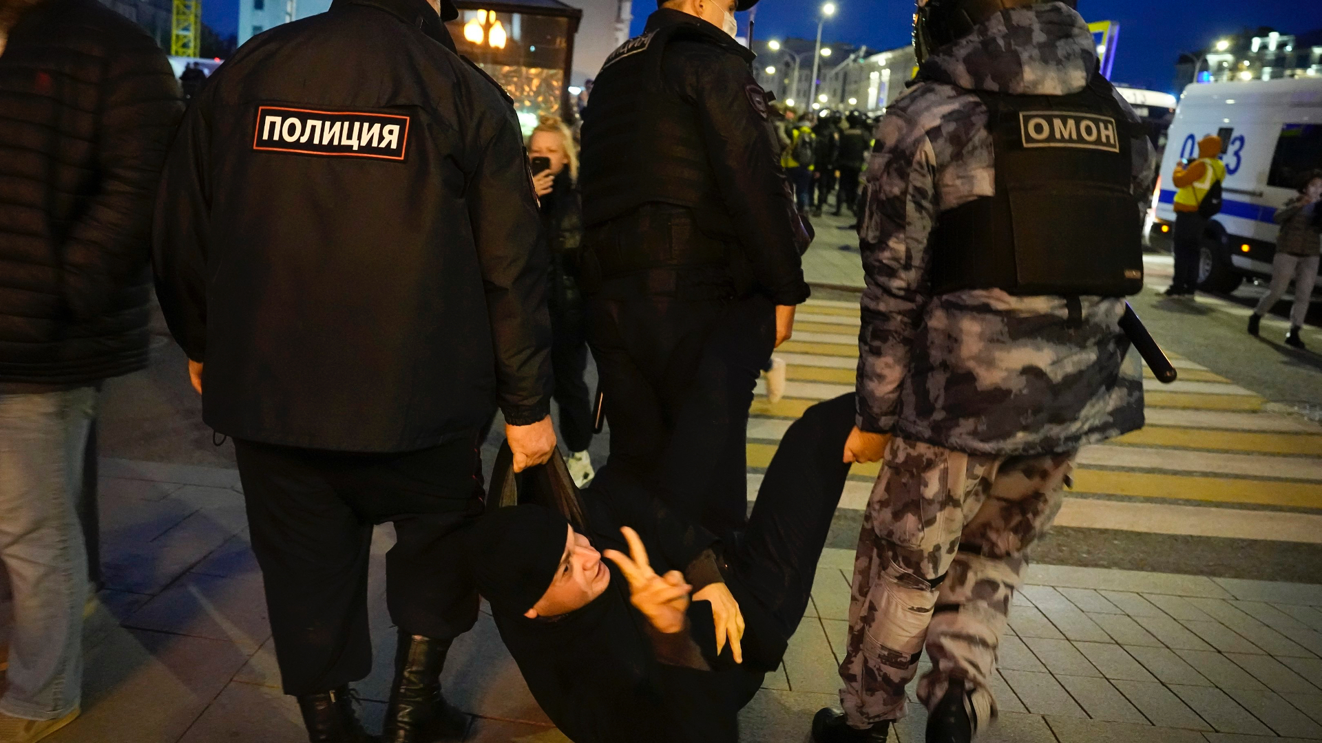 Demonštranta na proteste proti mobilizácii museli odniesť. Počas zadržania ukazoval mierové gesto.