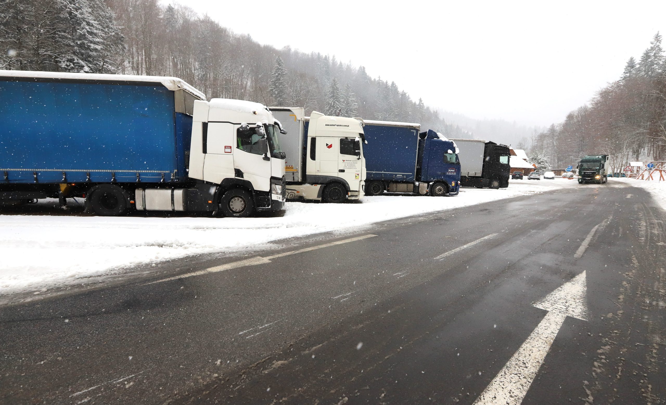 Na snímke odstavené kamióny pod horským priechodom Donovaly pri Banskej Bystrici .