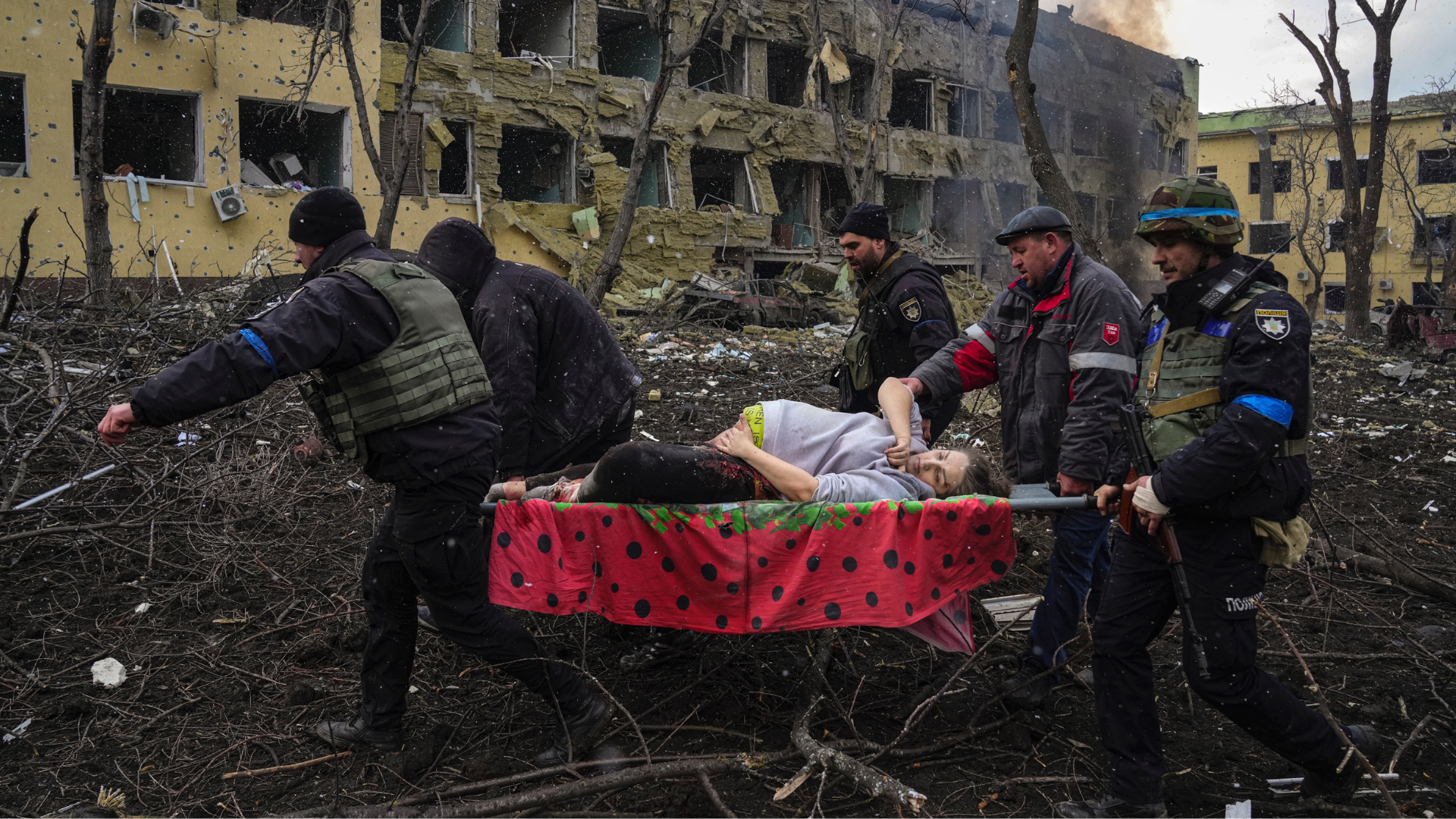 Ukrajinský pohotovostný personál a policajti odnášajú na nosidlách tehotnú ženu.