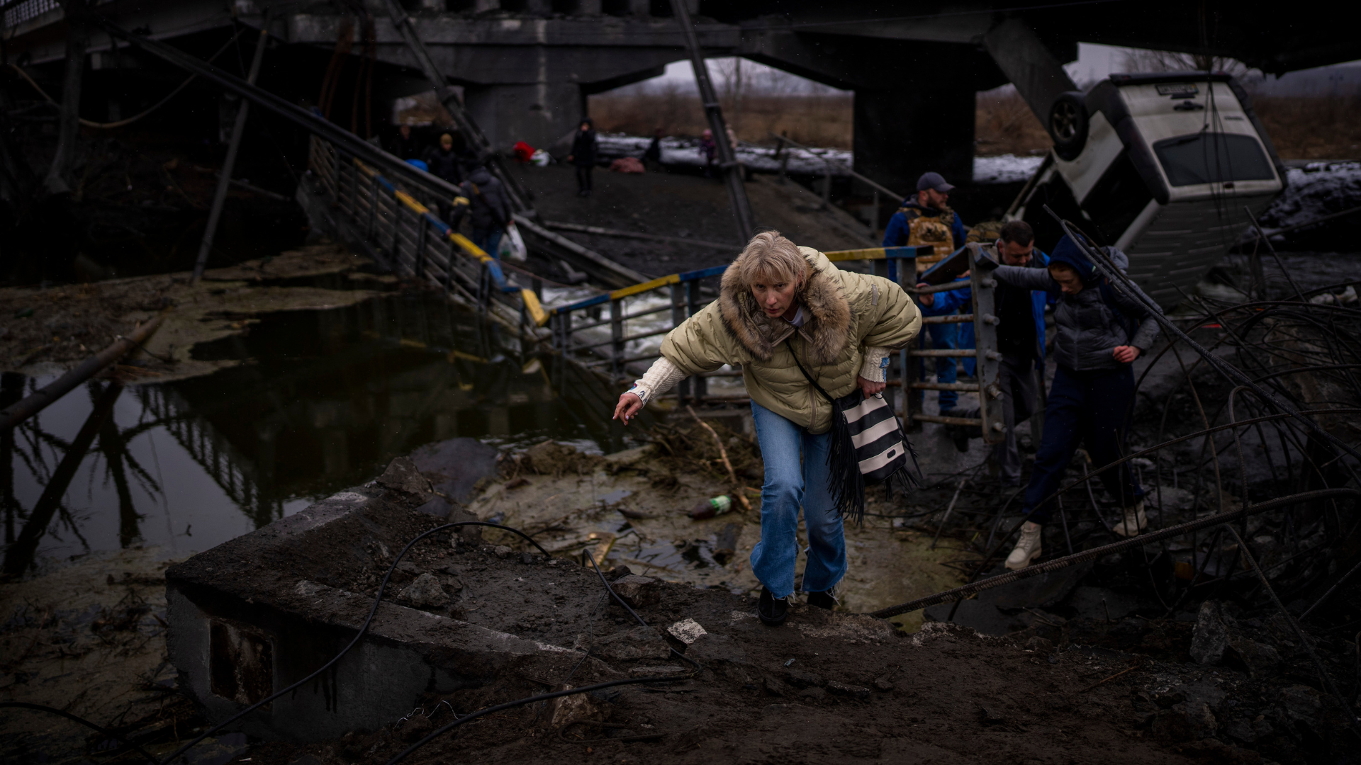 Ľudia utekajúci z trosiek po ruskom bombardovaní.