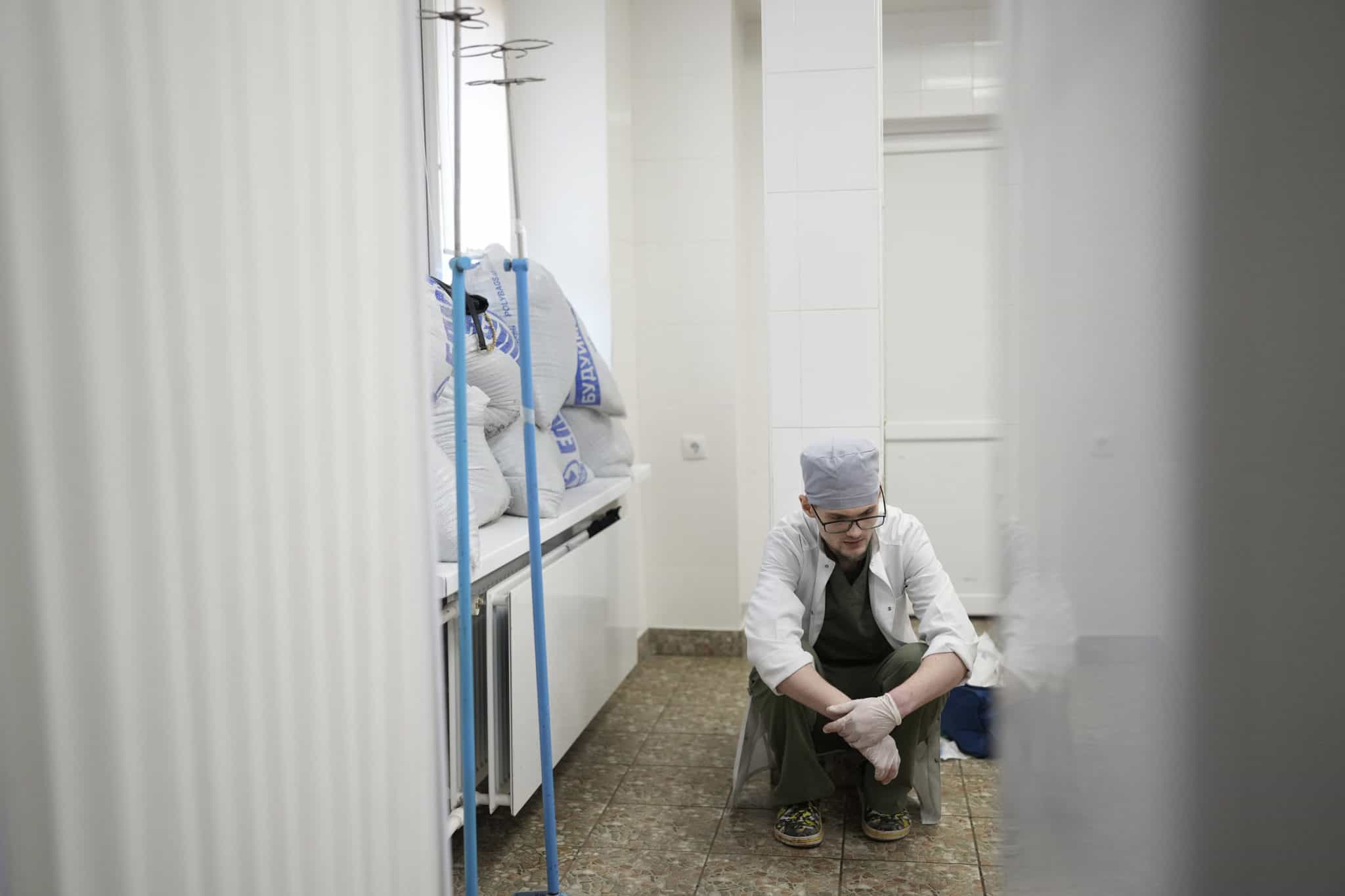 Doktor, ktorý sa snažil zachrániť Kirilla, čupí na podlahe, vediac, že už dieťaťu nedokáže pomôcť.