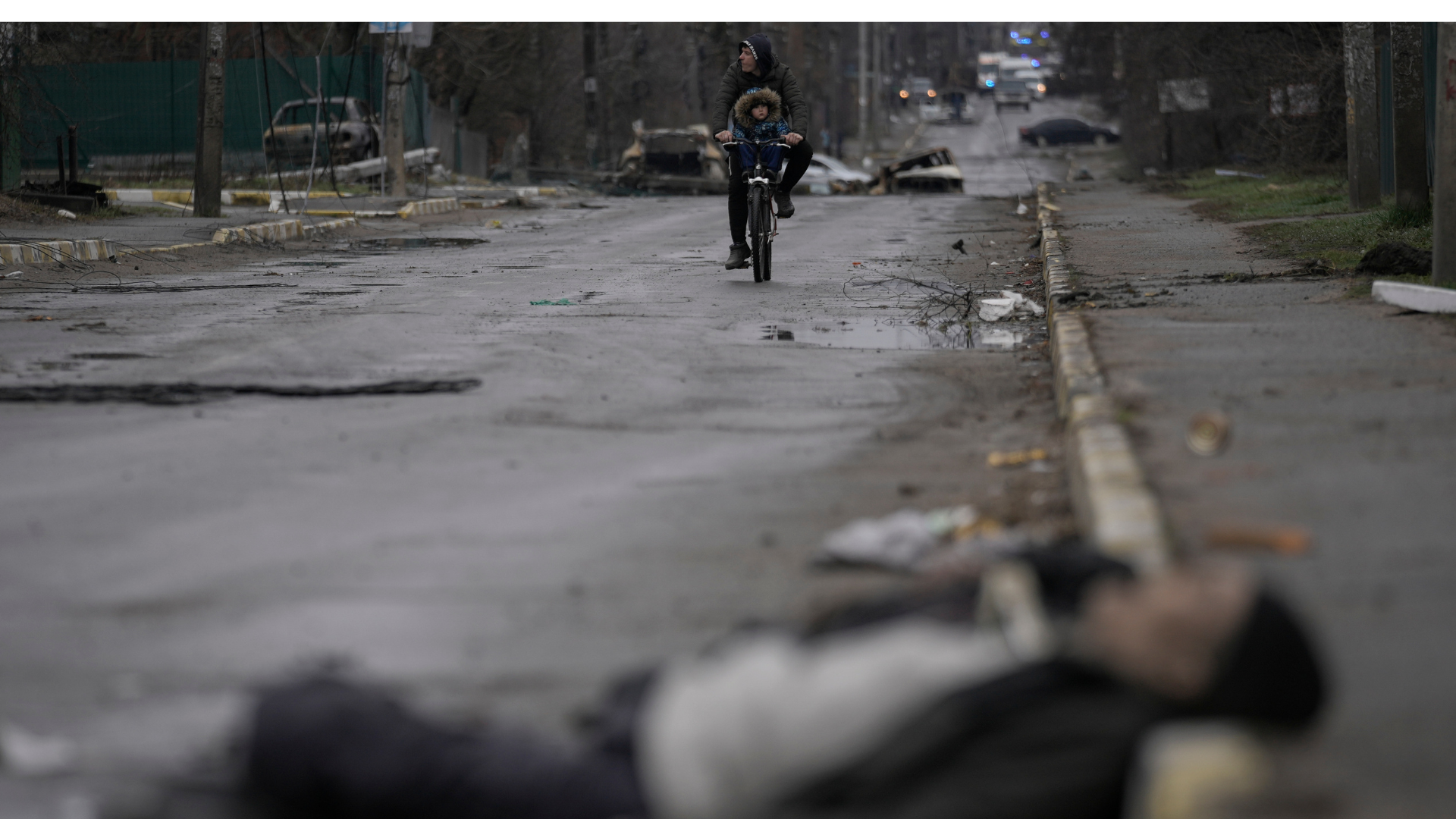 Muž a dieťa na bicykli, ktorí prechádzajú ulicou, ktorá je posiata telami zabitých Ukrajincov a Ukrajiniek.